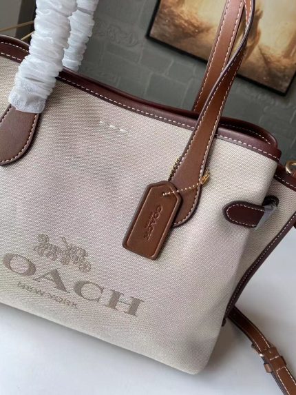 COACH City Tote Bag – Beige Canvas, Brown Leather Trim, Logo Embossing, Everyday Designer Tote