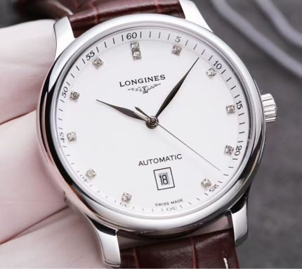 Longines Master Collection – Men’s Stainless Steel Automatic Watch with White Dial, Diamond Hour Markers, and Brown Leather Strap