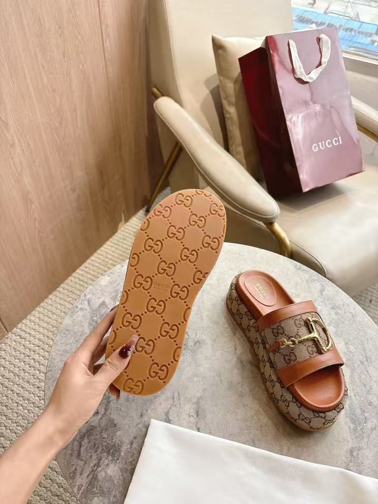 | Premium Beige Monogram Canvas Upper with Soft Texture – Luxurious fabric featuring Gucci’s iconic GG pattern for timeless elegance. Signature Gold-Tone Horsebit Buckle on Forefoot Strap – Iconic hardware detail that adds sophistication and brand identity. Stylish Metal Frame Design with Thin Ankle Straps – Modern structural element that enhances both style and support. Comfortable Wedge Heel with Rubber Sole for Stability – Provides height and comfort for all-day wear. Complete Original Packaging: Box, Dust Bag, Care Card & Tag – Full luxury presentation ideal for gifting or collection. |