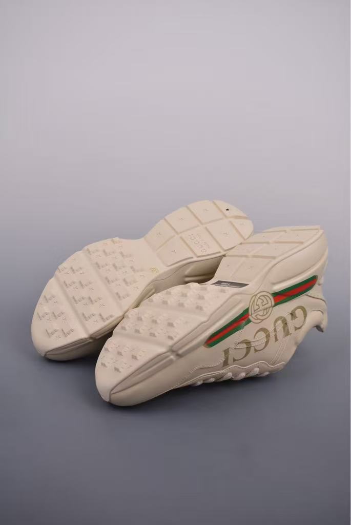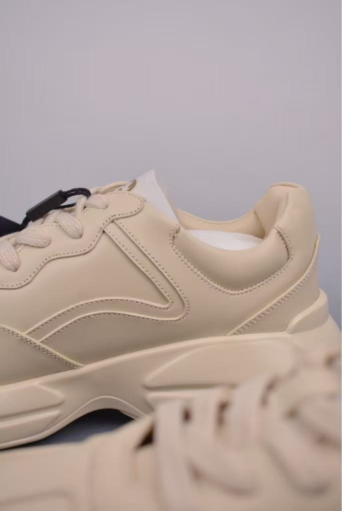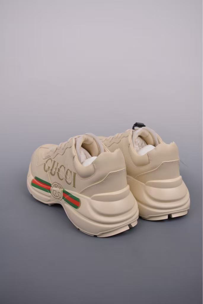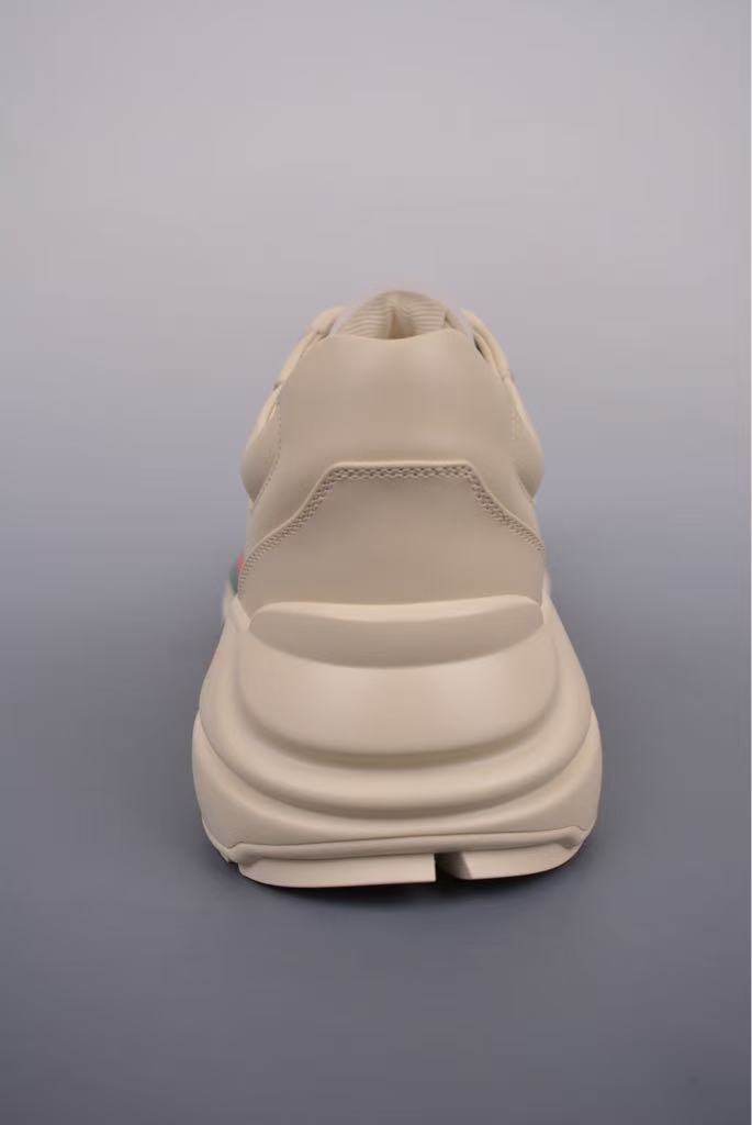 The signature red and green web stripe runs across the side panel, offering a bold contrast that instantly identifies the brand. This iconic detail is complemented by a white perforated mesh panel, which enhances breathability and adds a sporty touch to the silhouette. A gold-tone GG logo metal badge on the tongue serves as a luxurious accent, reinforcing the designer heritage. The thick rubber sole features a green heel cap and tan midsole, giving the shoe a vintage-inspired look with excellent grip and durability. Inside, the soft leather lining ensures comfort and support, while the beige laces maintain a cohesive, polished appearance. These sneakers are designed to be both stylish and practical — perfect for pairing with jeans, tailored pants, or even dresses. |