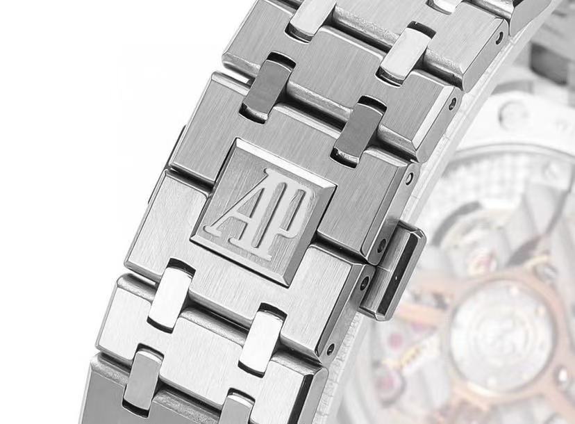 Blue Tapisserie Dial: The dial showcases Audemars Piguet’s iconic tapisserie motif in rich blue, providing a refined contrast with silver-toned hour markers and hands.