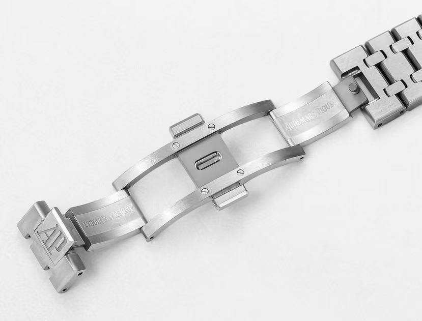 Blue Tapisserie Dial: The dial showcases Audemars Piguet’s iconic tapisserie motif in rich blue, providing a refined contrast with silver-toned hour markers and hands.