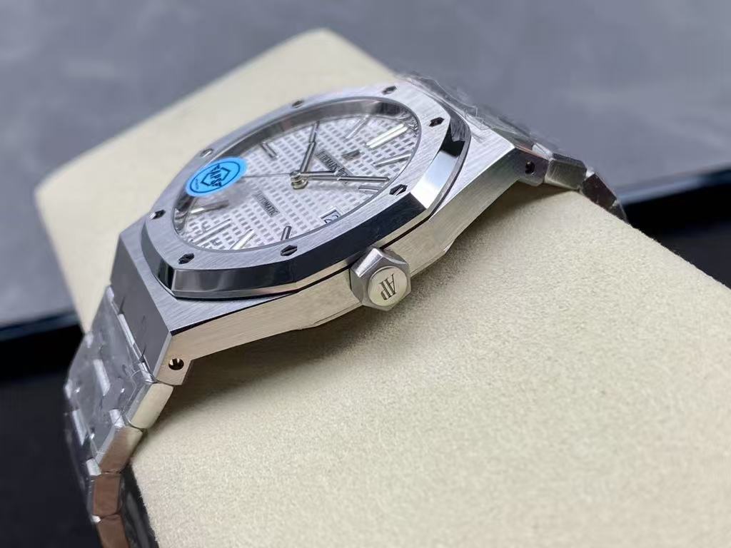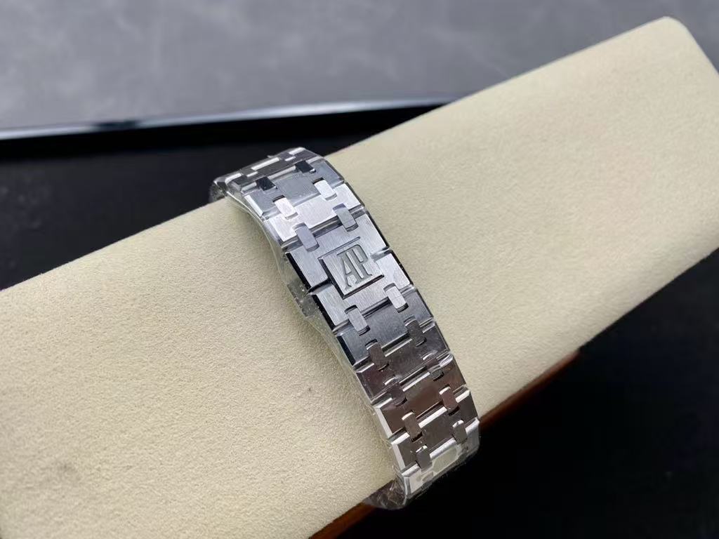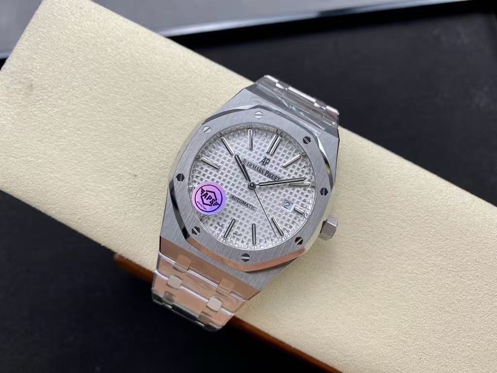 Silver Tapisserie Dial: The dial showcases Audemars Piguet’s signature tapisserie motif in a sleek silver tone, complemented by polished hour markers and hands for optimal readability.