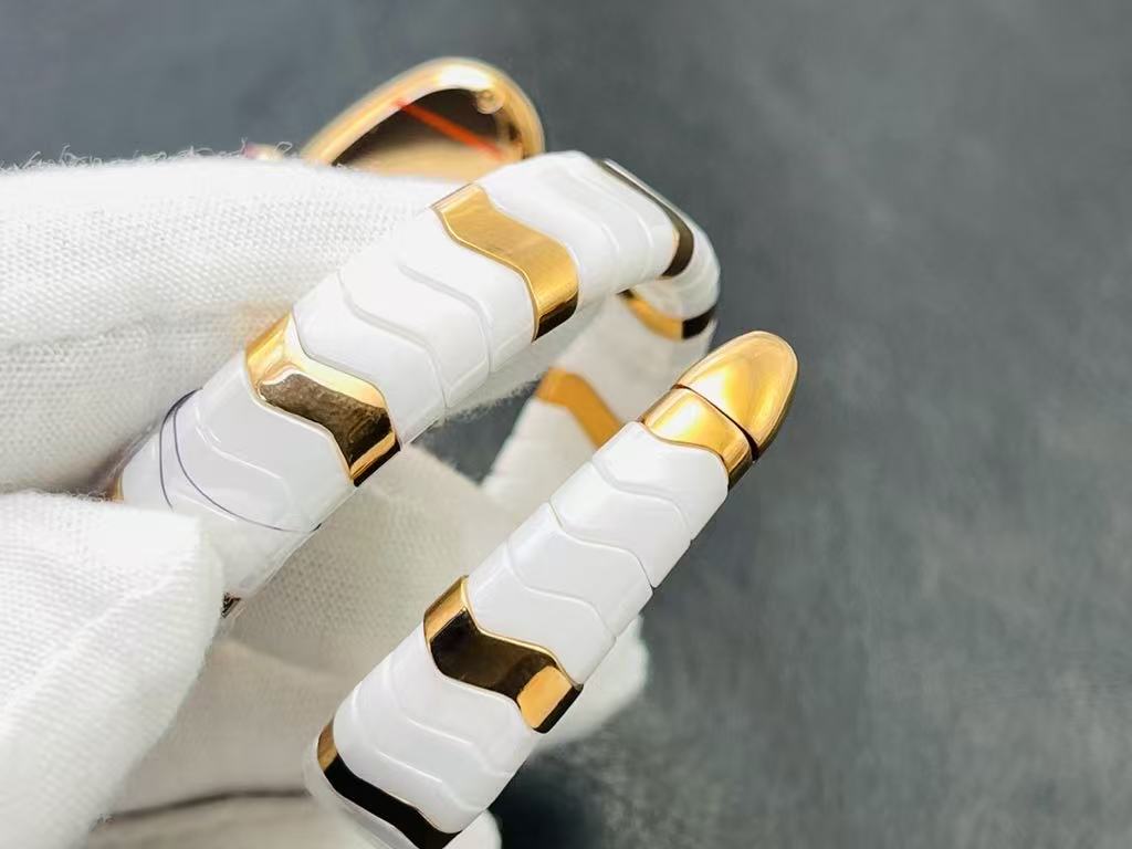 Bvlgari Serpenti – Women’s White & Gold Ceramic Bracelet Watch with Mother-of-Pearl Dial and Ruby Crown