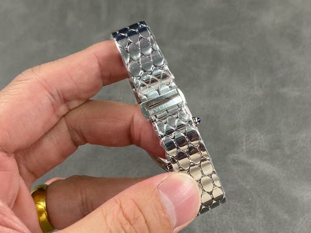 The teardrop-shaped dial is made from lustrous mother-of-pearl, offering a soft iridescent glow that enhances its elegance. Bold blue Roman numerals at 12 and 6 o’clock add a striking contrast, while matching blue hour markers and hands ensure refined readability. The signature sapphire-set crown adds a deep, regal touch of color—symbolizing Bvlgari’s heritage in fine jewelry and gemstone artistry.