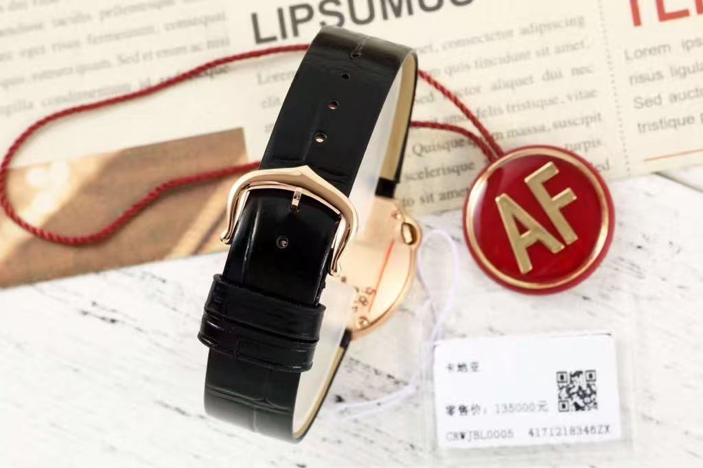 The white dial is adorned with bold Roman numeral hour markers in black, offering timeless charm and excellent readability. At the center, the “AF” logo replaces the traditional “CARTIER” branding, adding a distinctive signature touch, while “SAPPHIRE” is inscribed beneath it to highlight the high-quality crystal. Sleek rose gold hands glide smoothly across the face, complementing the refined aesthetic.