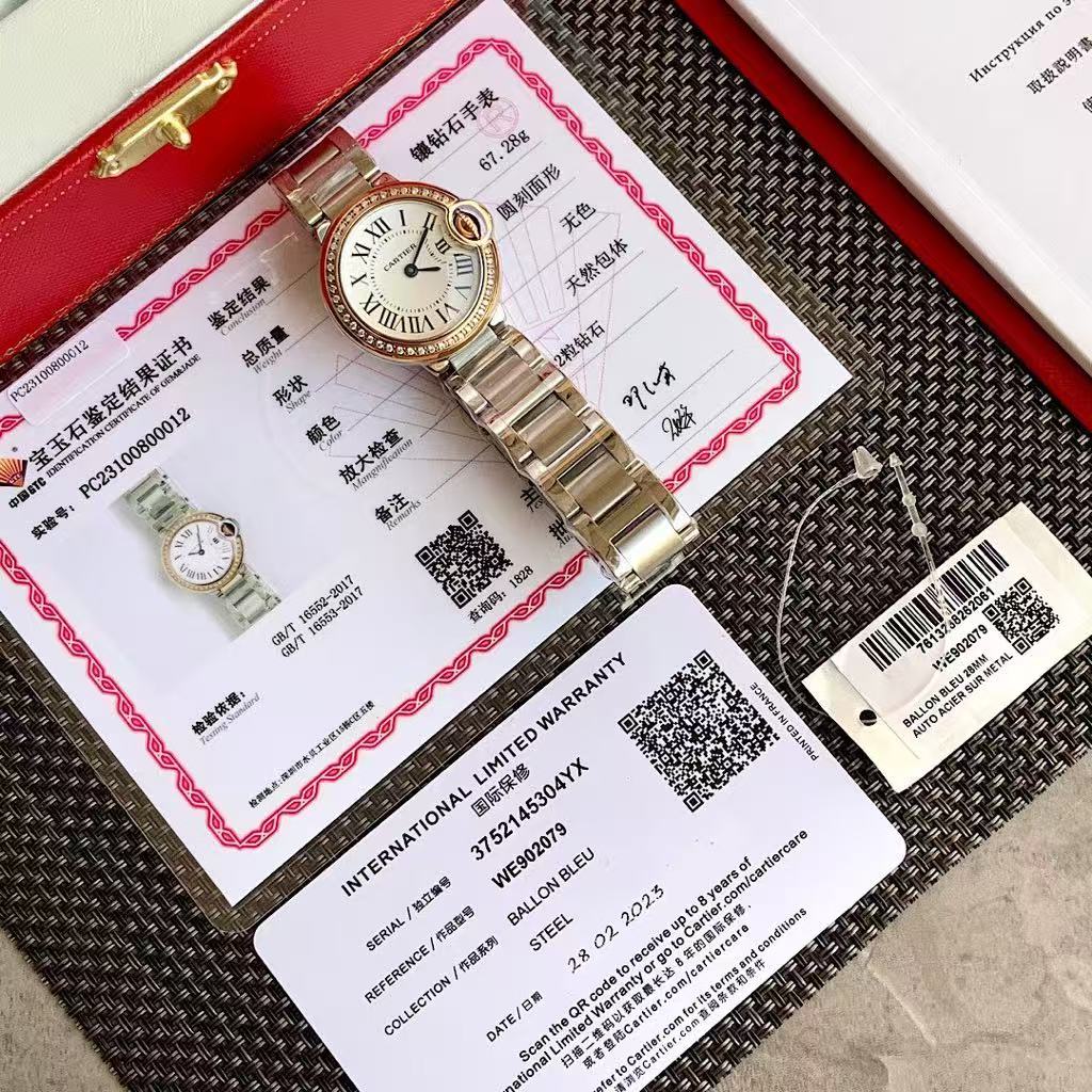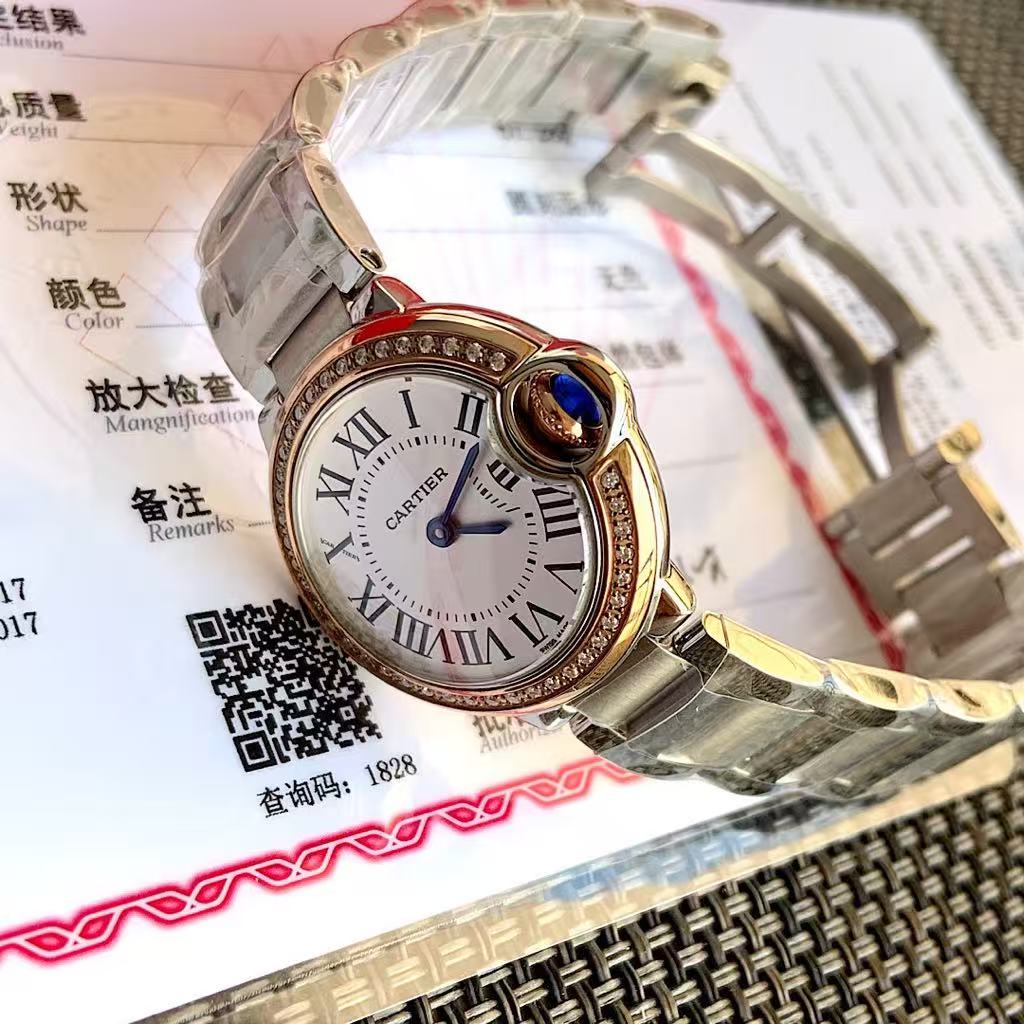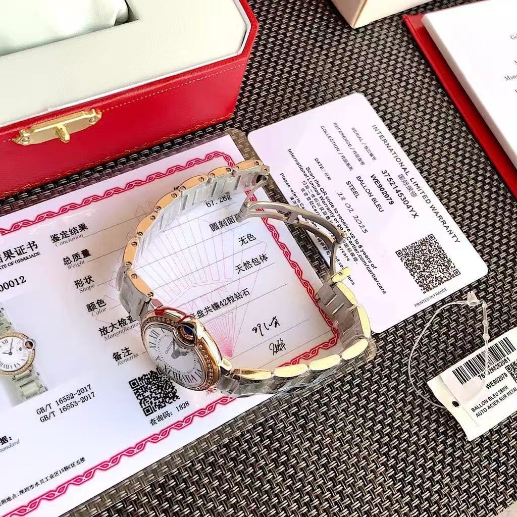 Cartier Ballon Bleu – Women’s Two-Tone Stainless Steel & Rose Gold Watch with Diamond Bezel, White Dial, and Roman Numerals