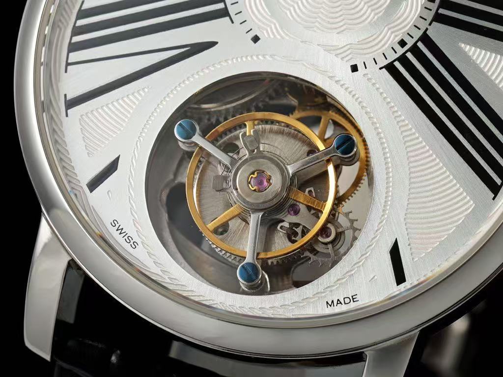 Skeletonized Silver Dial: Artistic design with visible tourbillon and guilloché pattern