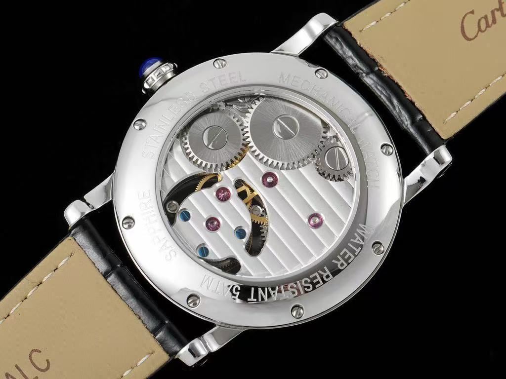 The silver dial is a work of art, adorned with skeletonized detailing that reveals the inner mechanics while maintaining a sense of elegance and balance. Bold Roman numeral hour markers in black provide timeless charm and excellent readability, framed by a delicate guilloché pattern that enhances depth and texture. The iconic “CARTIER” logo sits prominently at the center, beneath blue sword-shaped hands that glide smoothly across the dial. A subtle “SWISS MADE” inscription underscores its origin and craftsmanship excellence.