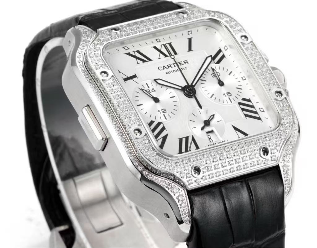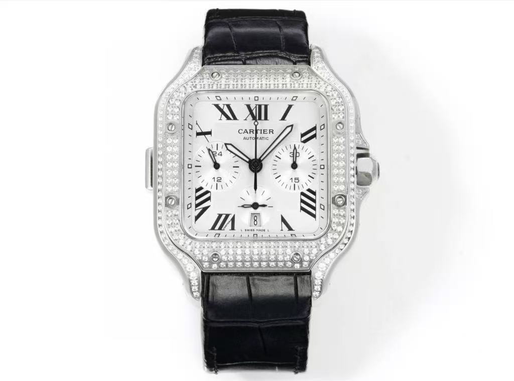 Cartier Santos de Cartier – Women’s Diamond-Paved Chronograph Automatic Watch with White Dial, Roman Numerals, and Black Alligator Strap