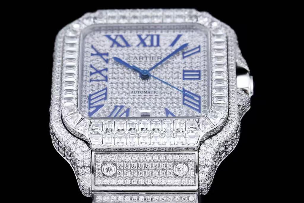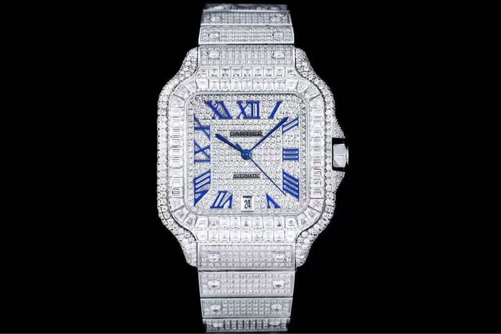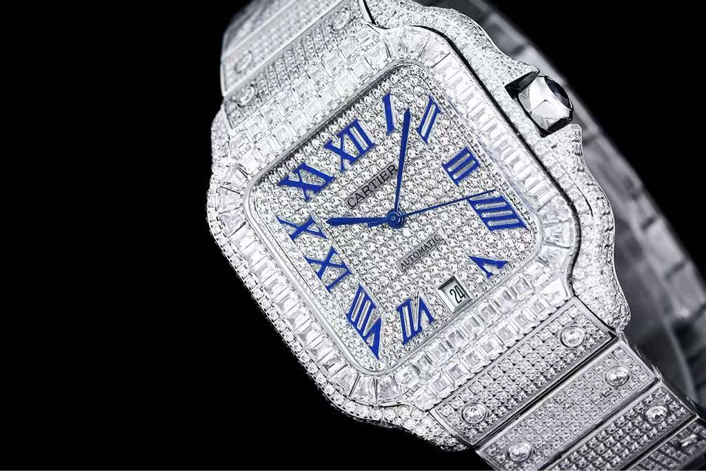 The diamond-paved dial showcases an intricate pattern of tiny stones, offering a mesmerizing sparkle beneath bold blue Roman numeral hour markers—a striking contrast that enhances visibility and sophistication. At the center, the “CARTIER” logo sits elegantly above the “AUTOMATIC” inscription, while sleek blue sword-shaped hands glide smoothly over the luminous surface. A date window at 6 o’clock provides practical functionality without compromising the luxurious aesthetic.
