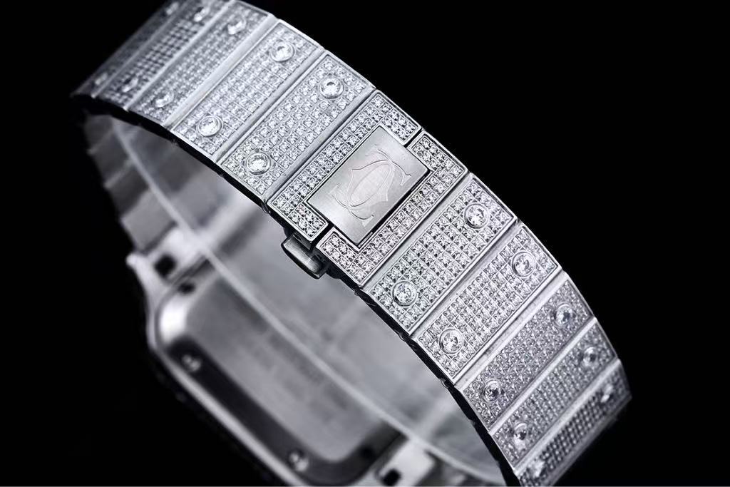 Make a bold statement with the Cartier Santos-Dumont, reimagined in ultimate luxury and brilliance. This extraordinary timepiece features a square-shaped case crafted from 18K white gold, fully encrusted with brilliant-cut diamonds across the bezel, lugs, and integrated bracelet—creating a dazzling, radiant surface that captures light from every angle. The iconic Santos silhouette is elevated to new heights of opulence, blending classic design with modern extravagance.