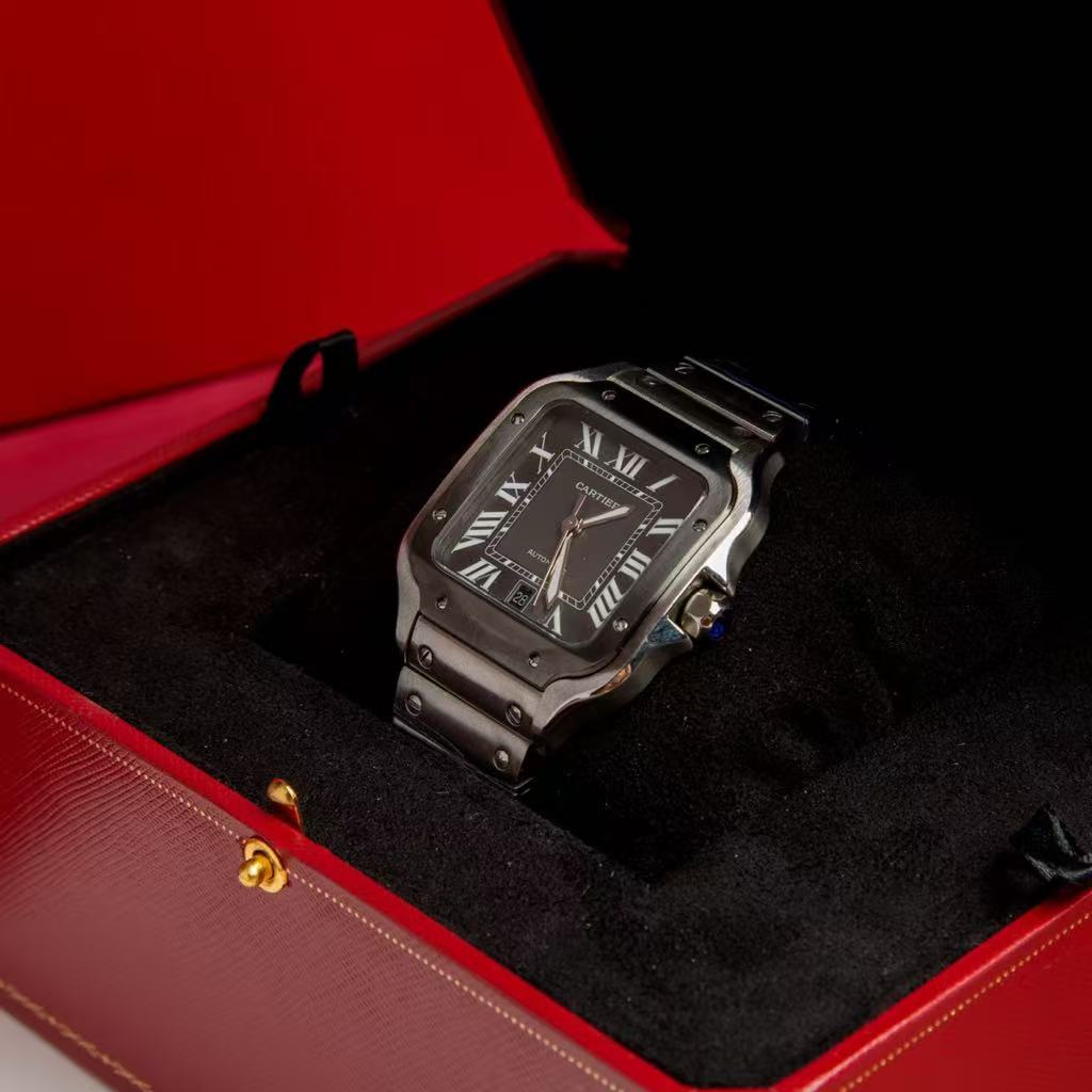 Presented on a black cushioned display against a red Cartier box, this Santos-Dumont radiates confidence, strength, and enduring luxury. Whether worn daily or paired with formal attire, it is a symbol of modern masculinity, heritage, and refined taste.