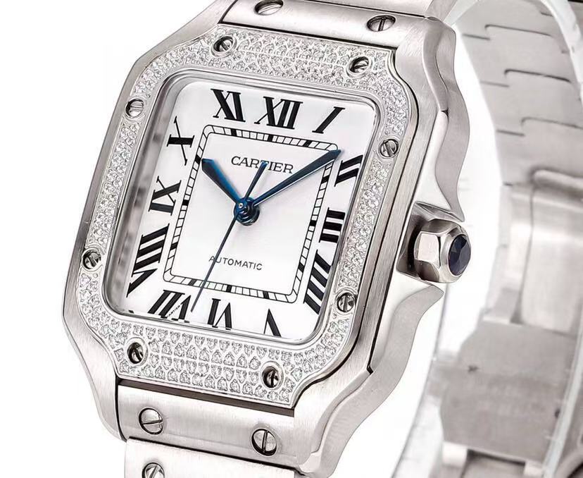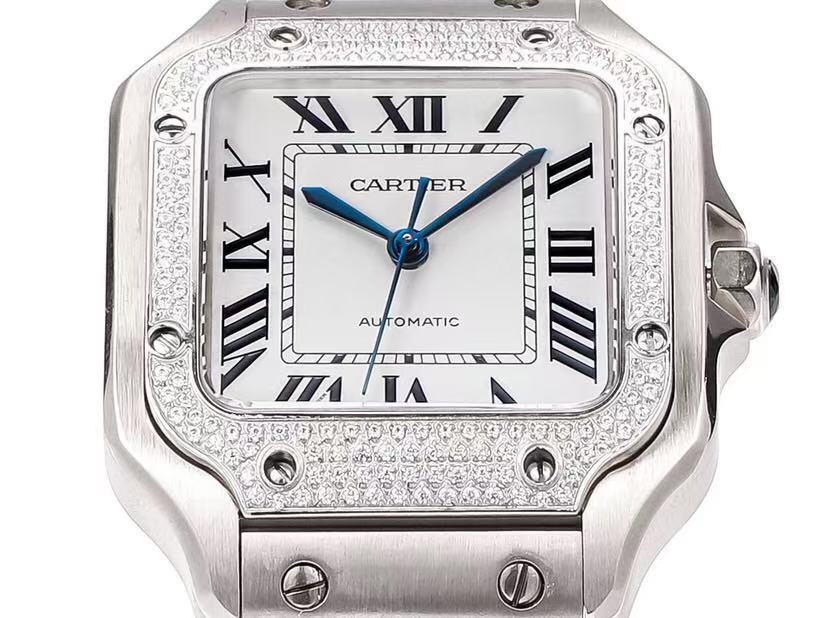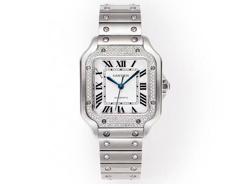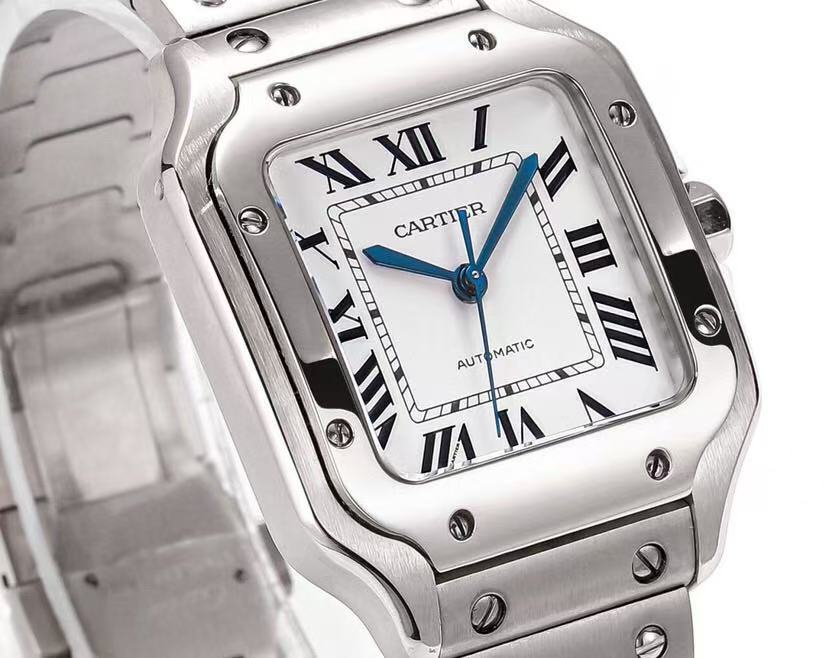 The white dial is framed by a clean, minimalist layout with bold Roman numeral hour markers, offering both classic charm and exceptional readability. The iconic “CARTIER” logo sits elegantly at the center, beneath striking blue sword-shaped hands that glide smoothly across the dial. A subtle “AUTOMATIC” inscription highlights the mechanical excellence within, while a small date window at the 6 o’clock position adds practical functionality without compromising aesthetics.