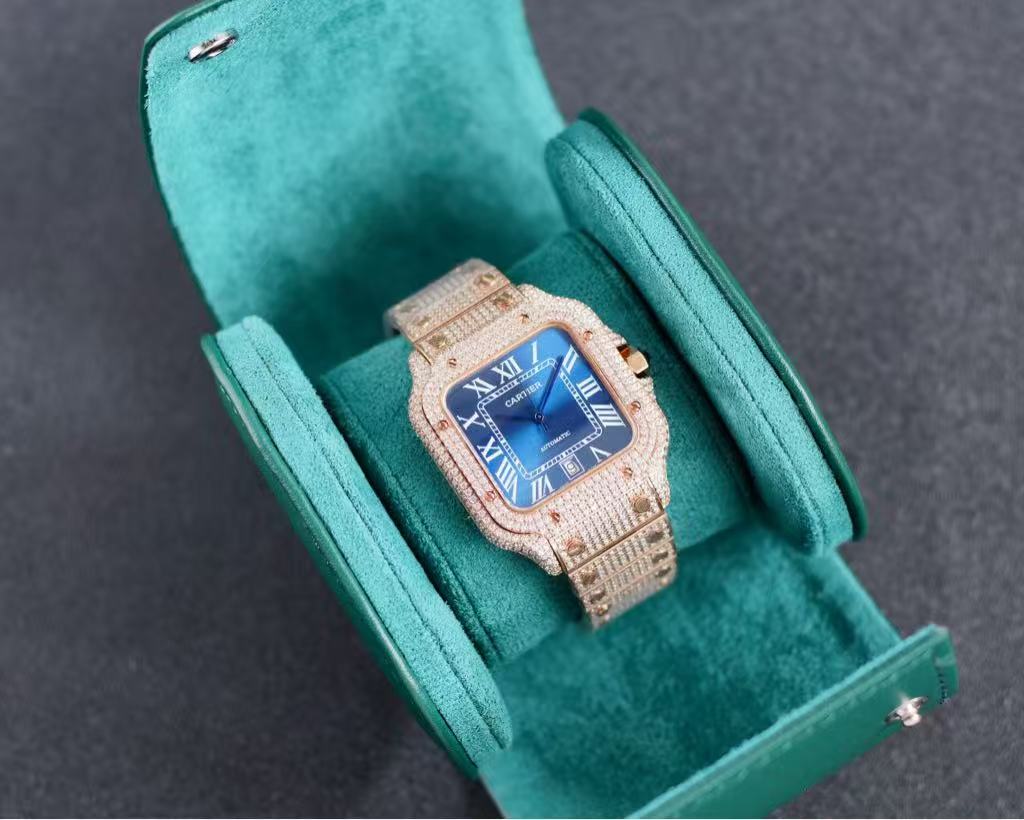 The diamond-paved dial showcases an intricate pattern of tiny stones, offering a mesmerizing sparkle beneath elegant purple Arabic numerals—a bold and artistic choice that adds a touch of mystery and individuality. At the center, the “CARTIER” logo sits prominently above the “AUTOMATIC” inscription, while sleek blue sword-shaped hands glide smoothly over the luminous surface. A date window at 6 o’clock provides practical functionality without compromising the luxurious aesthetic.