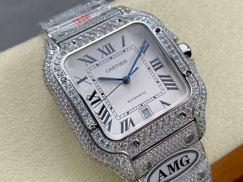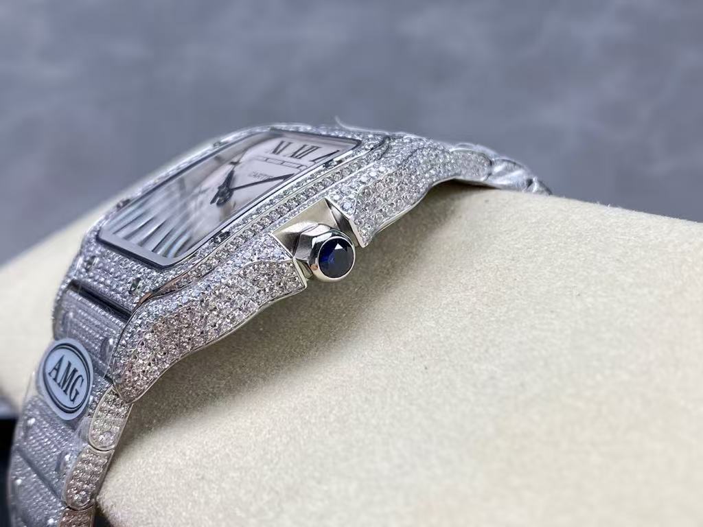 Elevate your elegance to new heights with the Cartier Santos-Dumont, a breathtaking masterpiece of luxury and precision engineering. This exclusive AMG Edition features a fully paved diamond-encrusted case and bracelet, crafted from 18K white gold and set with countless brilliant-cut diamonds that sparkle brilliantly under every light. The dazzling design transforms the iconic Santos silhouette into a true statement of opulence and refinement.