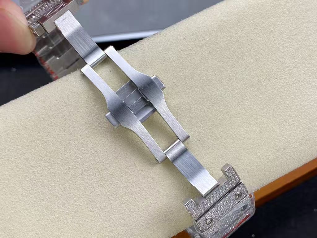 The integrated bracelet is fully paved with diamonds, featuring articulated links that wrap comfortably around the wrist. The folding clasp ensures durability and ease of wear, delivering a seamless blend of form and function. A distinctive “AMG” emblem on the clasp signifies its premium craftsmanship and limited-edition status, making it a collectible piece for discerning connoisseurs.