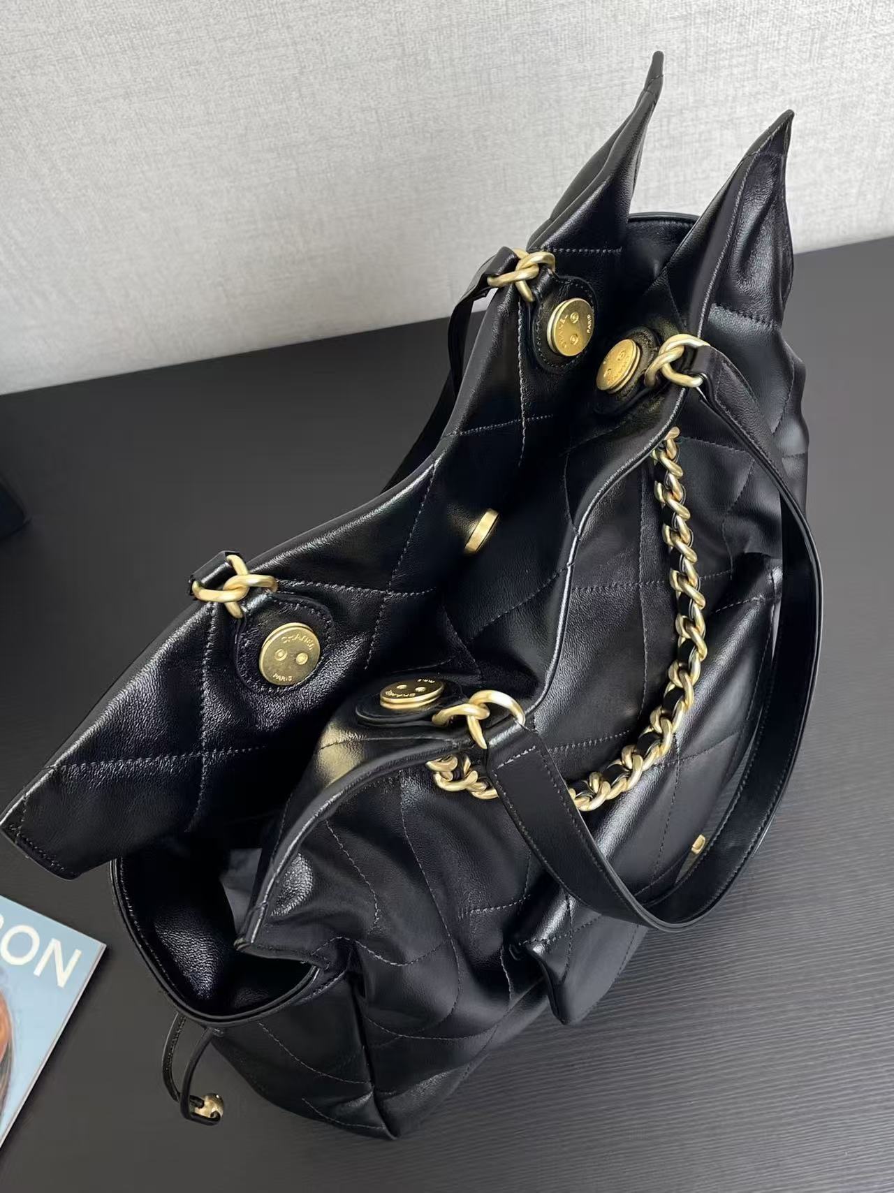 Chanel-Style Giant Tote Bag – Black Glossy Leather with Gold-Tone Chain & Drawstring Detail