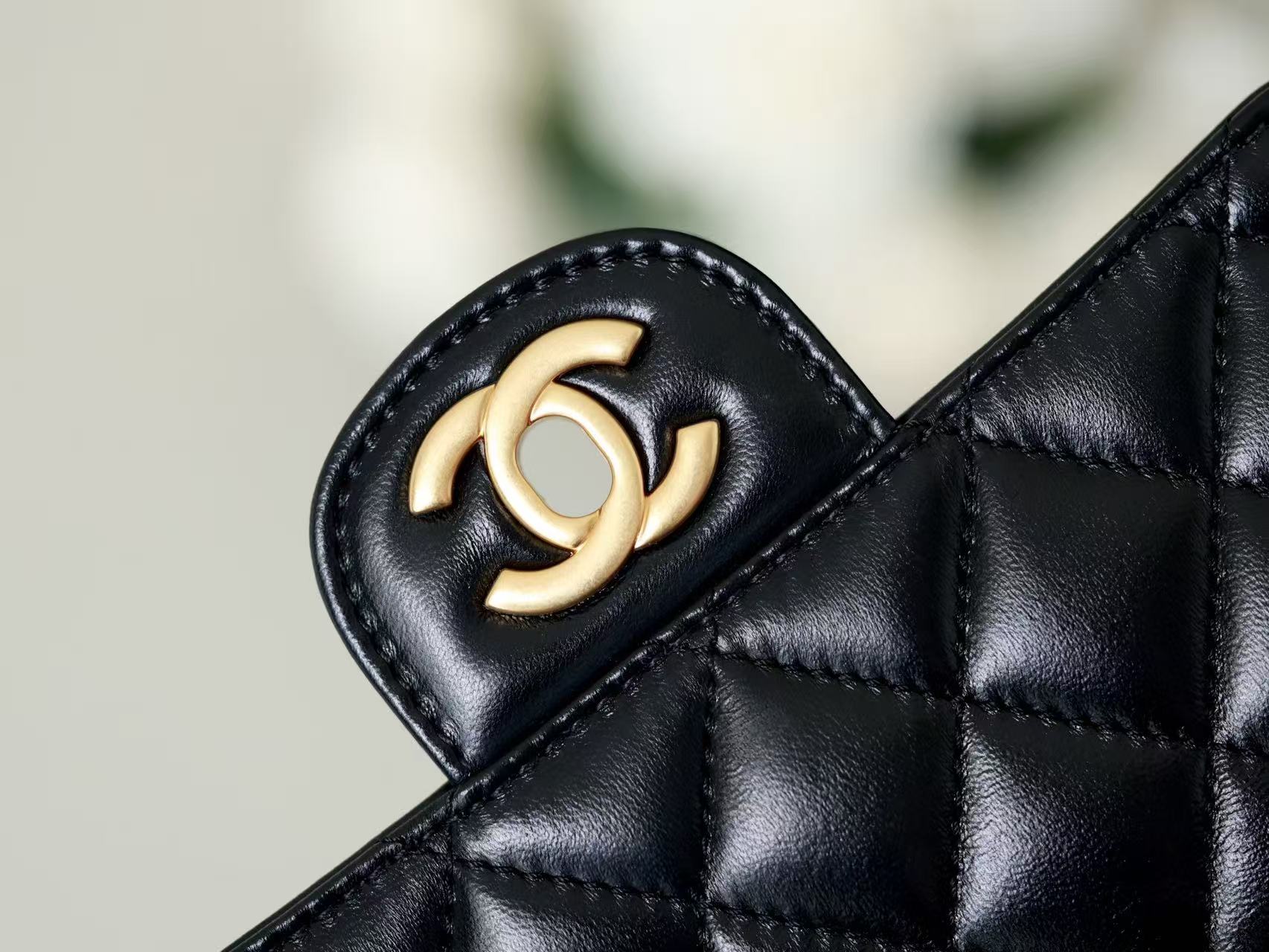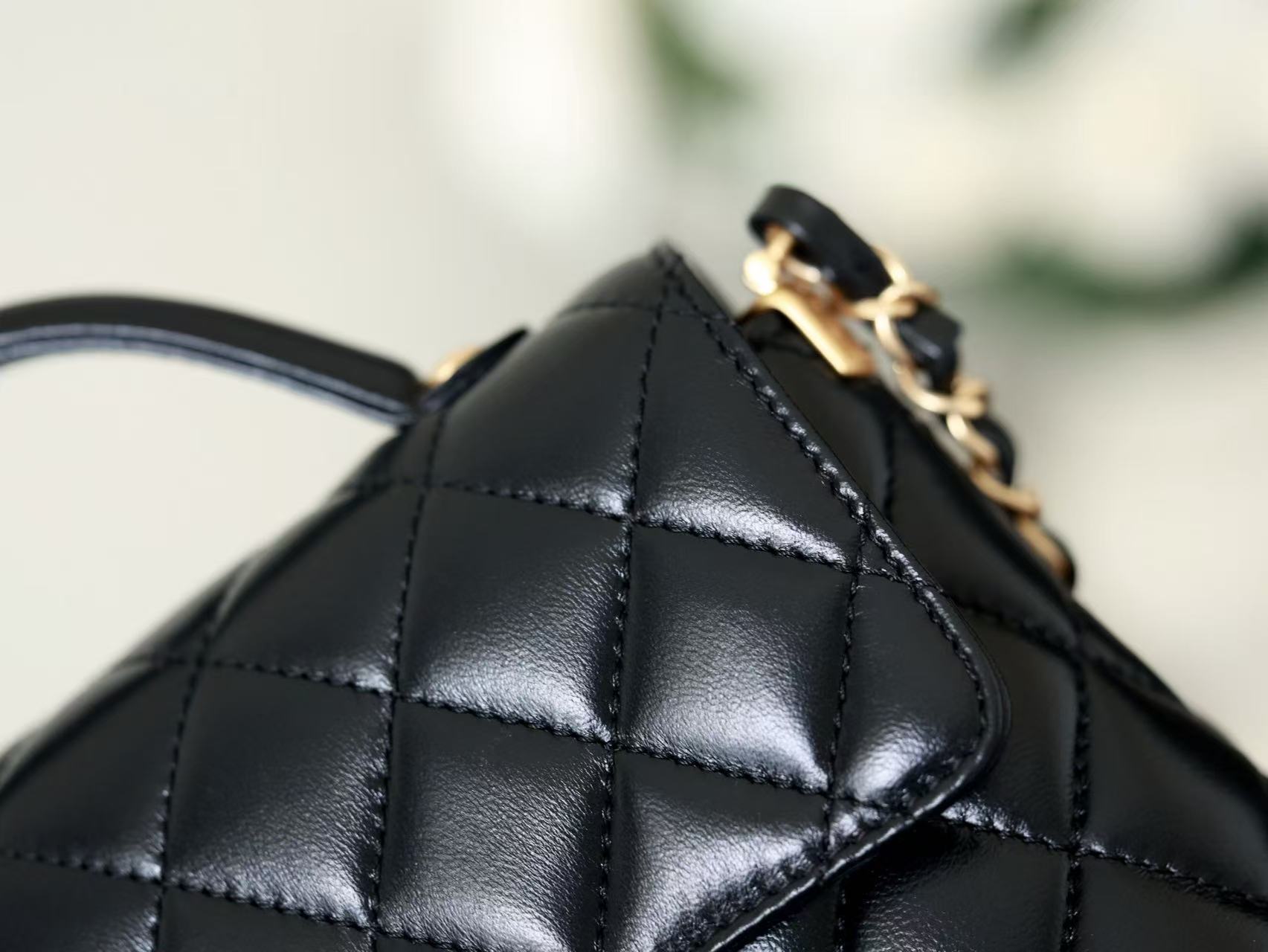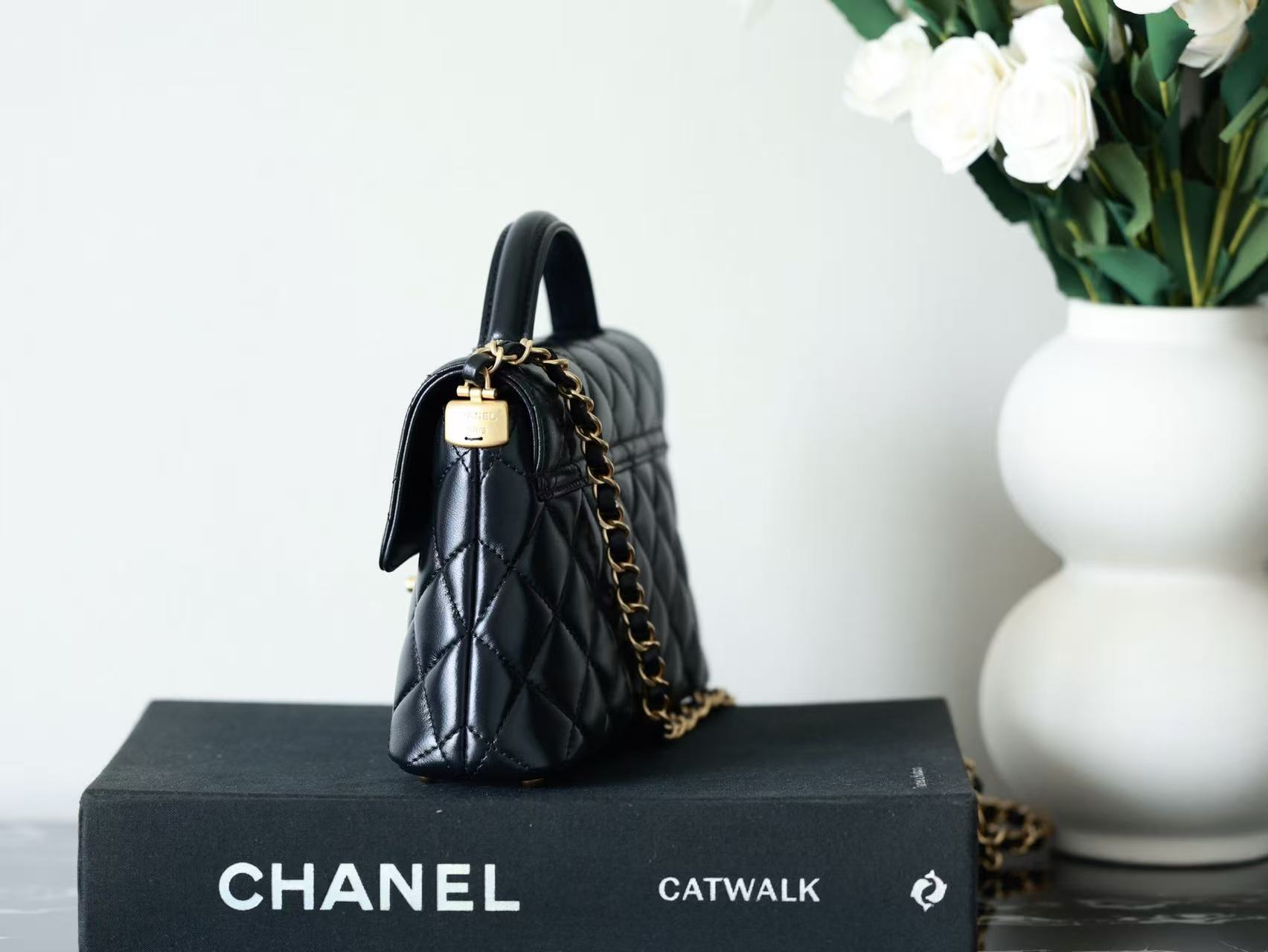 Chanel-Style Mini Flap Bag – Black Glossy Leather with Gold-Tone CC Logo & Top Handle
