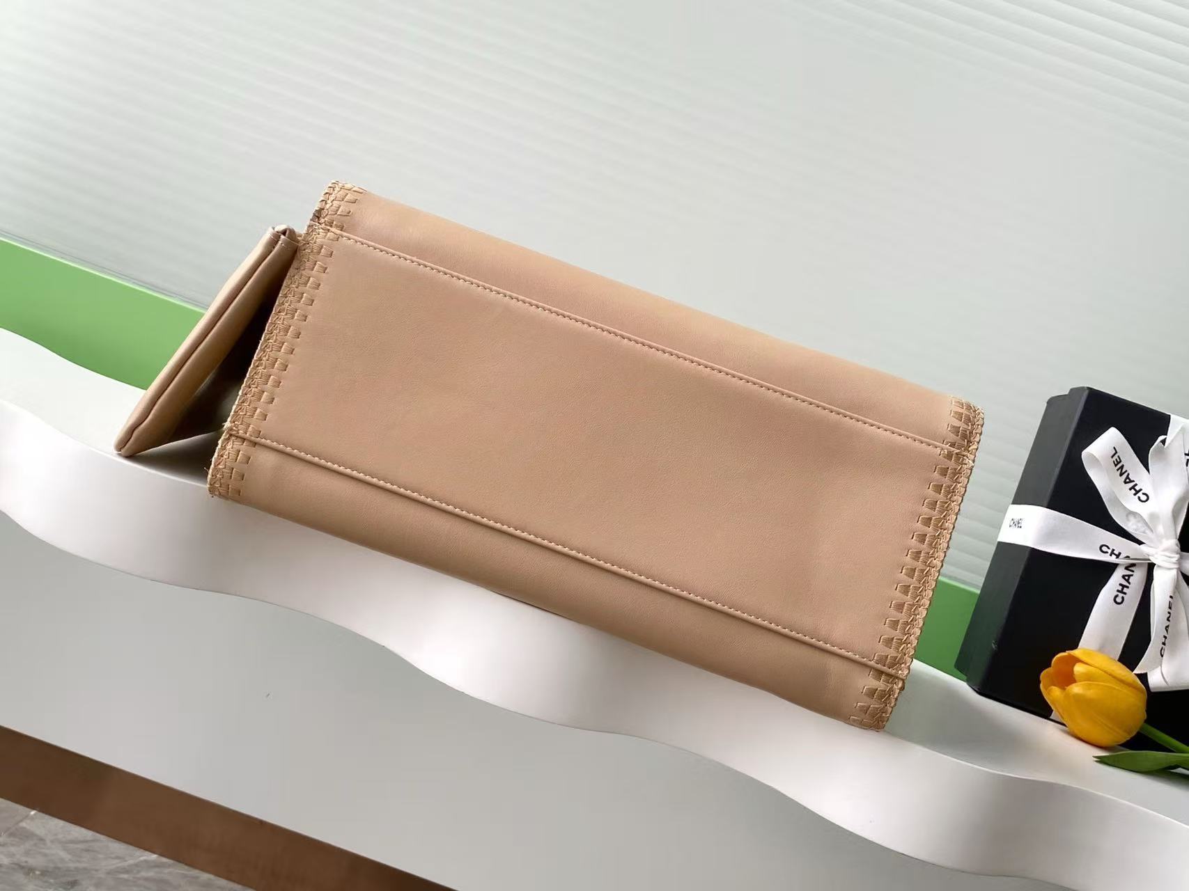 The rattan-inspired raffia sides add a lightweight, airy feel, perfect for beach days, weekend getaways, or city strolls. The large front panel is adorned with the hand-embroidered “CHANEL PARIS” text and CC logo, creating a striking visual impact. Designed with dual top handles and an adjustable chain-and-leather shoulder strap, it offers versatile carry options — whether you’re carrying it by hand, over your shoulder, or crossbody.