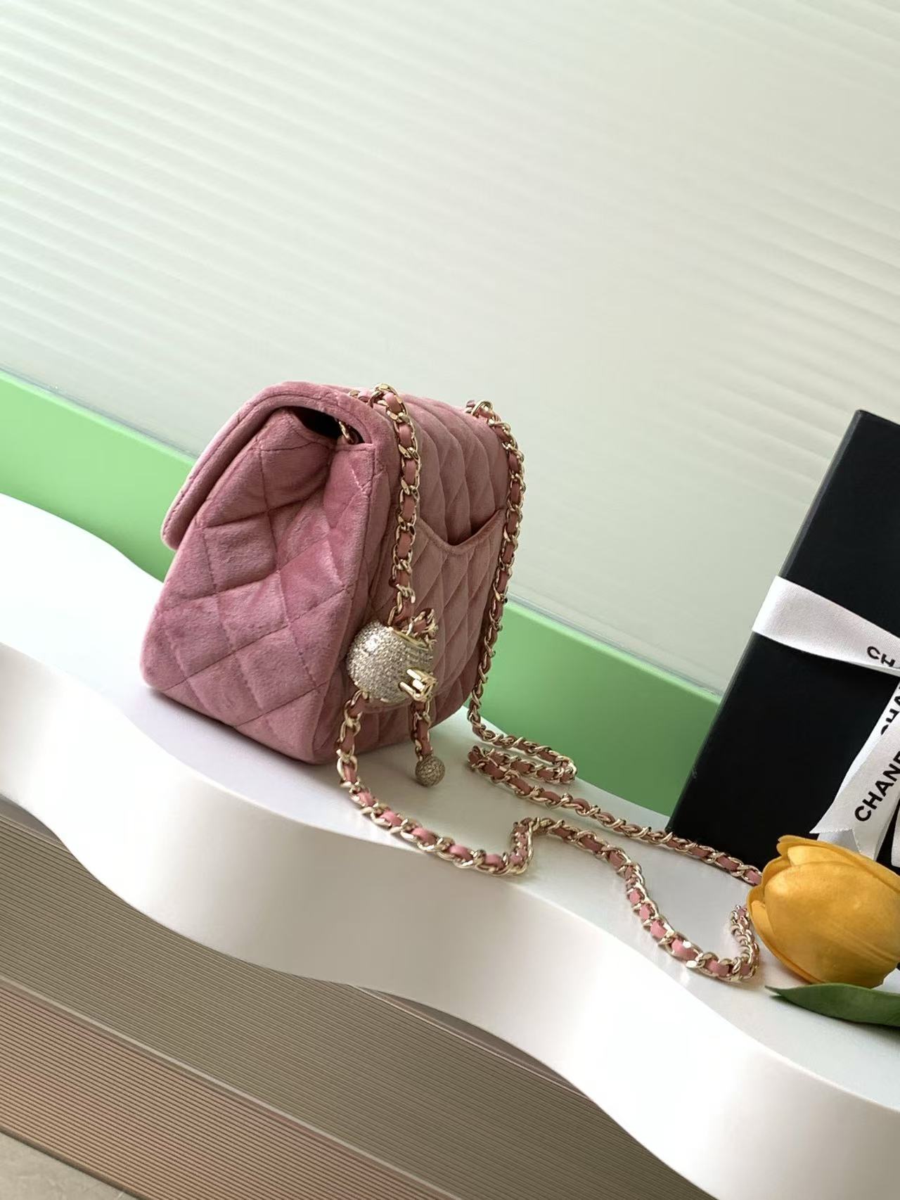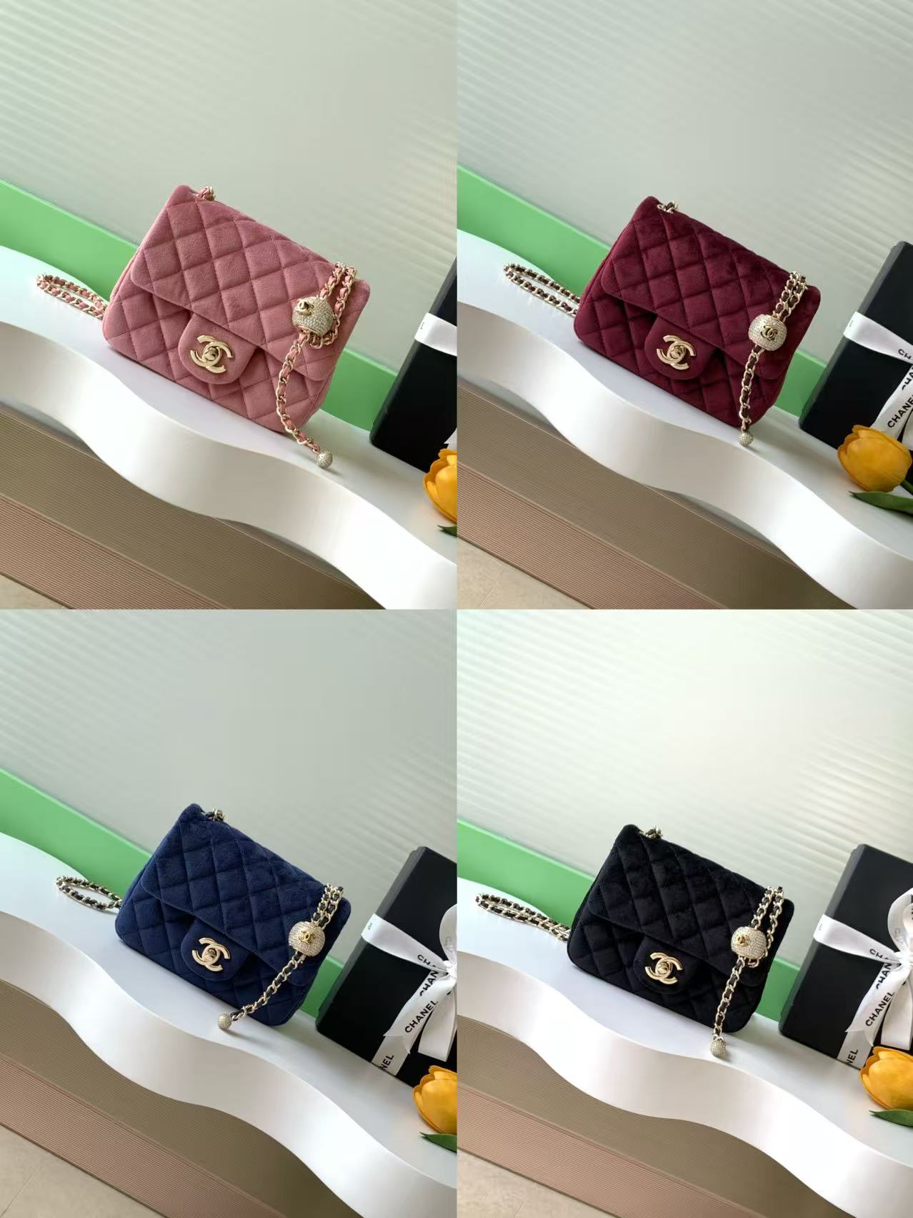 Chanel-Style Velvet Flap Bag – Classic Quilted Design with Gold-Tone Chain & Pearl Ball Charm (Multi-Color Available)
