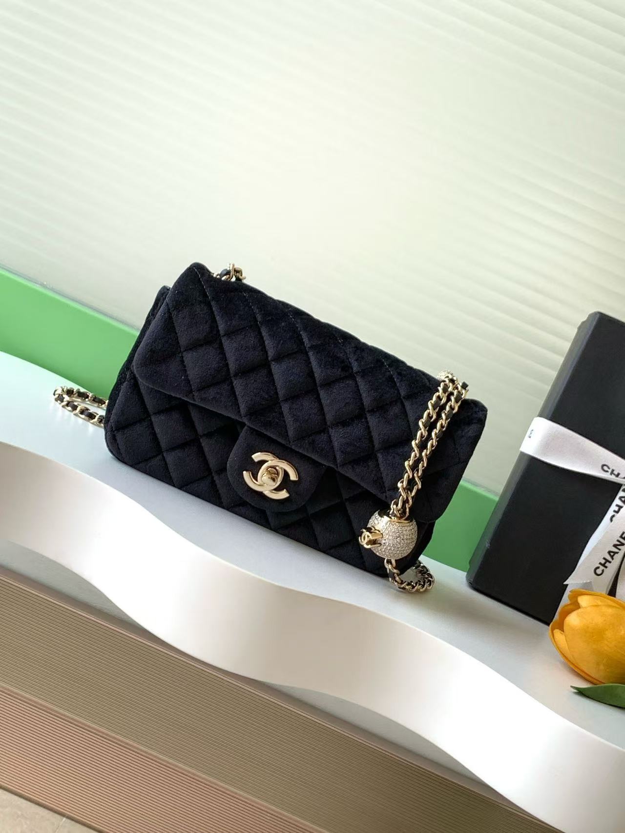 Chanel-Style Velvet Flap Bag – Classic Quilted Design with Gold-Tone Chain & Pearl Ball Charm (Multi-Color Available)