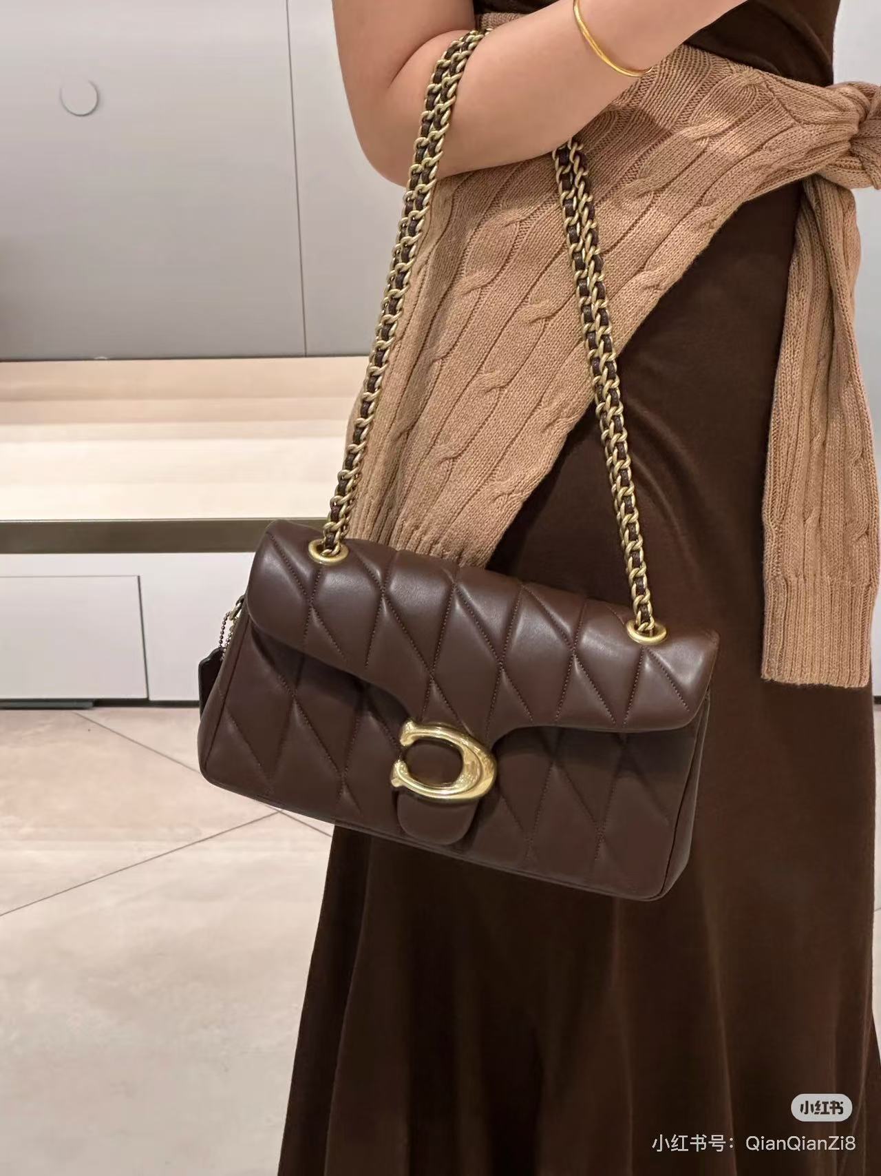 COACH C Logo Quilted Shoulder Bag – Dark Brown Leather, Gold-Tone Chain Strap, Signature C Clasp, Designer Flap Bag