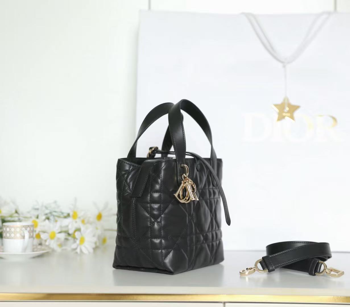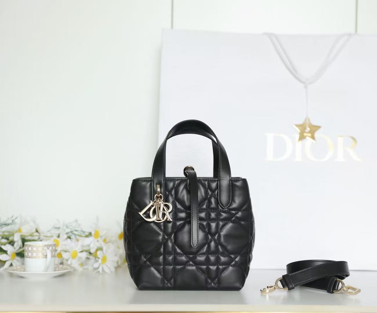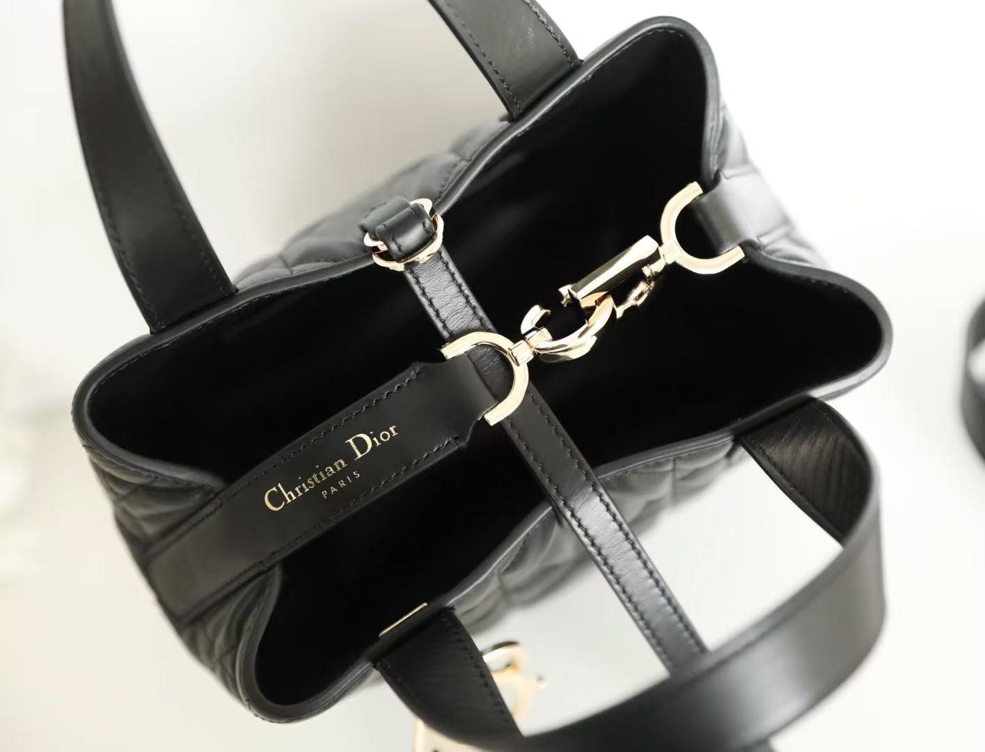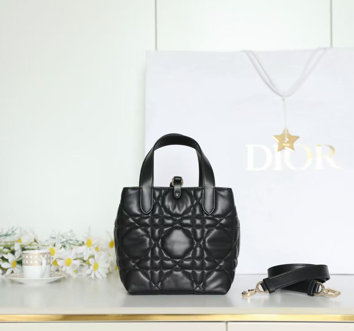 Adorned with a signature Dior logo charm in metal hardware, every detail speaks of heritage and refinement. The dual top handles allow for comfortable hand carry or stylish arm-drape presentation — making it ideal for both casual and formal occasions.