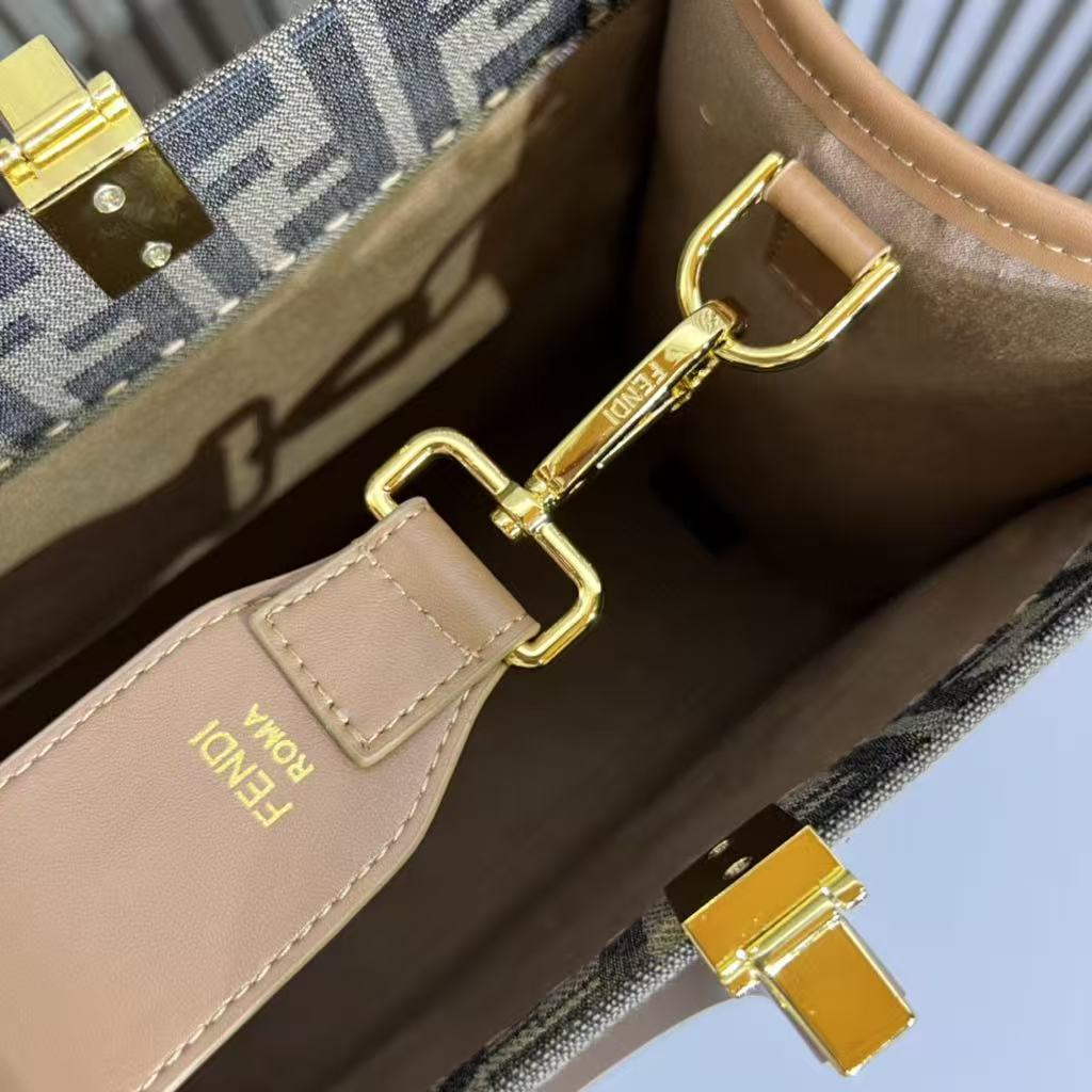 The large-scale black “FENDI ROMA” print dominates the front panel, creating an instant visual impact that is both powerful and timeless. The tortoiseshell-effect top handle adds a touch of vintage charm and ergonomic comfort, while the gold-tone metal hardware enhances the bag’s refined aesthetic. A detachable wide shoulder strap with embossed “FENDI” branding allows you to carry it crossbody or over the shoulder for maximum versatility.