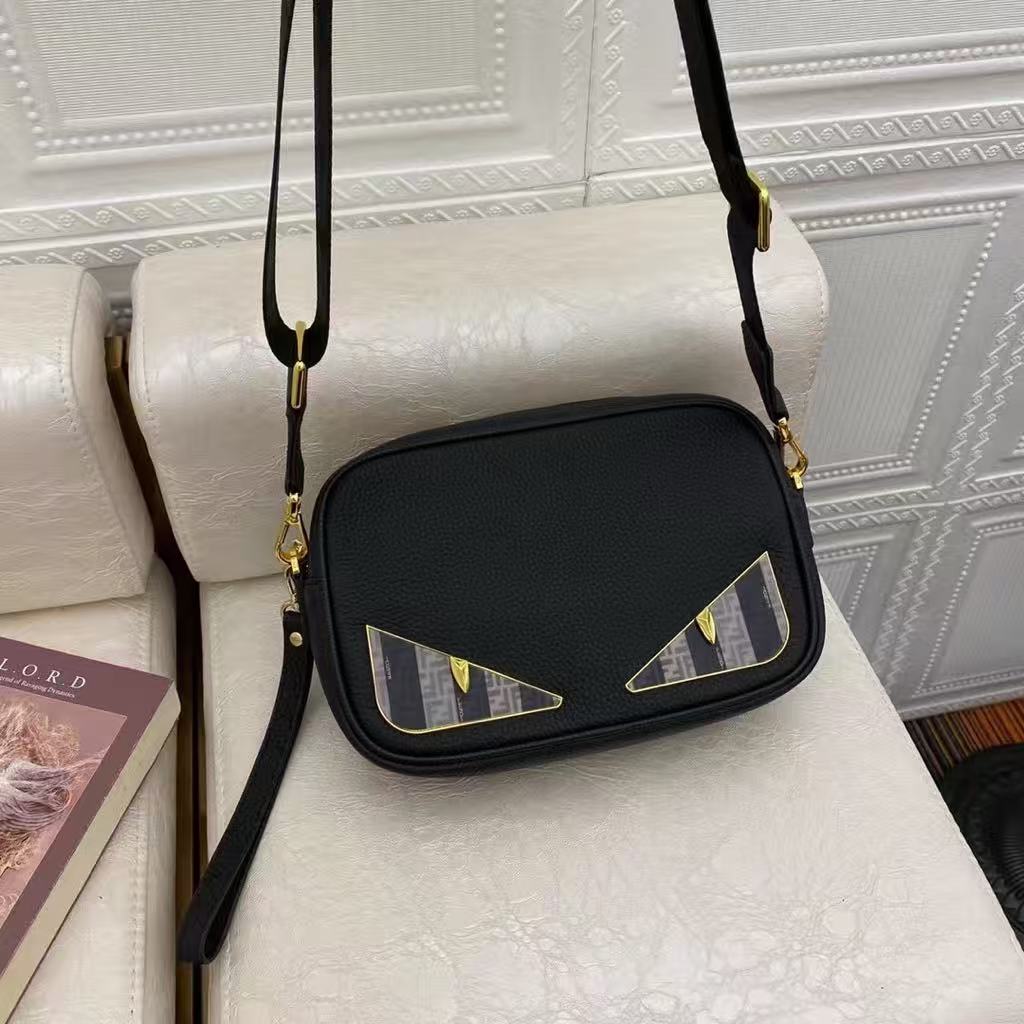 Fendi-Style Mini Bag – Black Pebbled Leather with Iconic FF Monogram “Cat Eye” Detail, Gold-Tone Hardware & Adjustable Strap