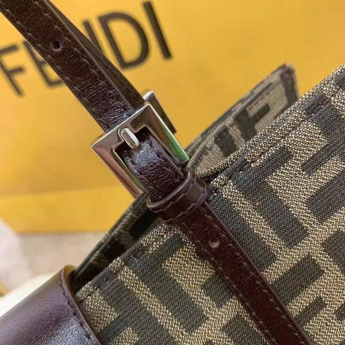 The signature Zucca print covers the entire surface in a repeating FF motif, creating a luxurious visual statement that is both bold and instantly recognizable. At the center, the metal buckle closure adds a touch of architectural detail, enhancing both style and functionality while securing your belongings with ease.