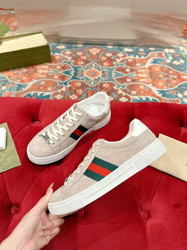 Gucci Beige Monogram Sneakers – Classic Web Stripe, “ACE” Metal Plate, Original Box & Dust Bag