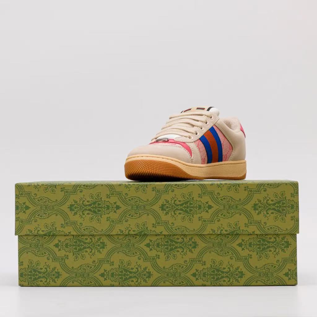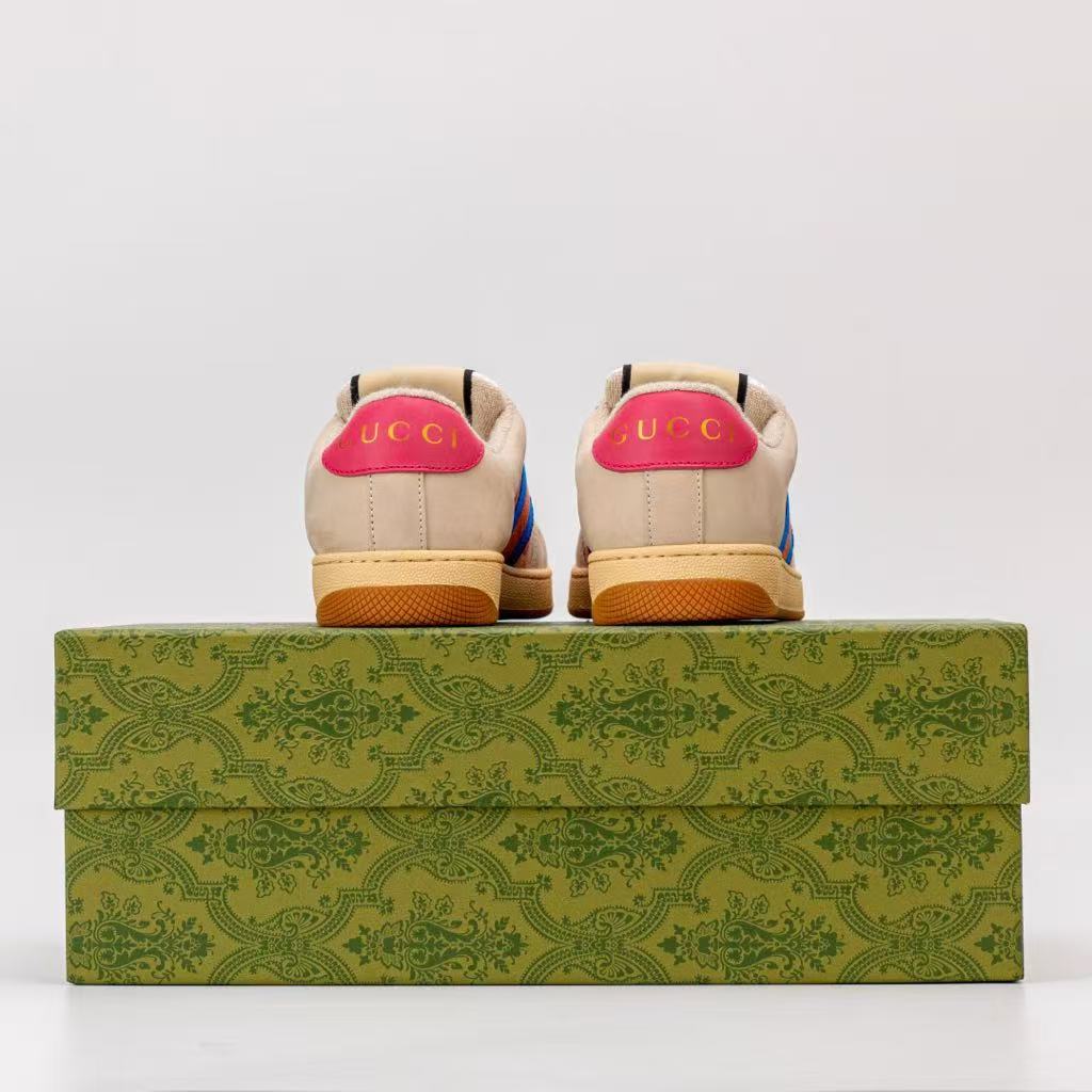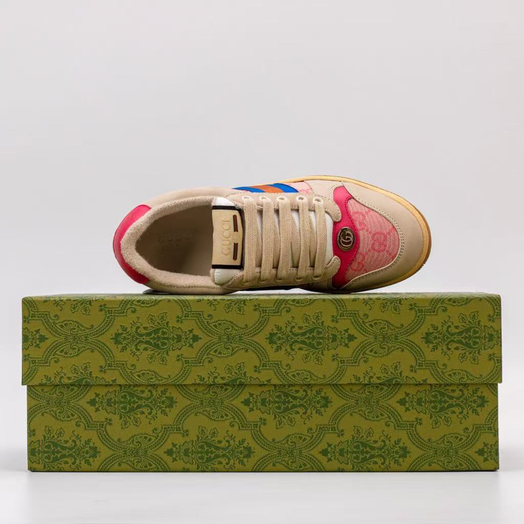 Gucci Beige Sneakers – Pink GG Monogram, Blue & Orange Web Stripe, Vintage Sole, Original Box & Dust Bag