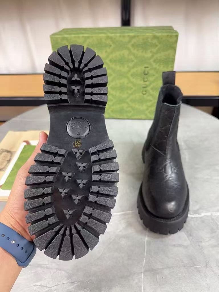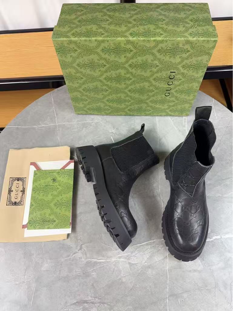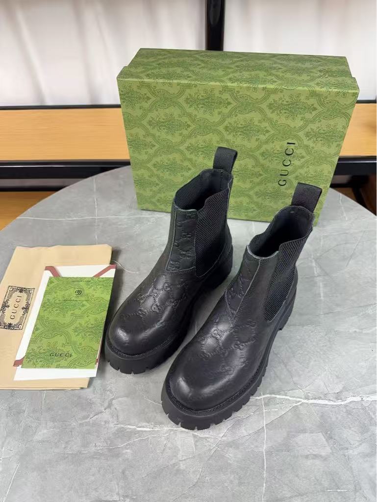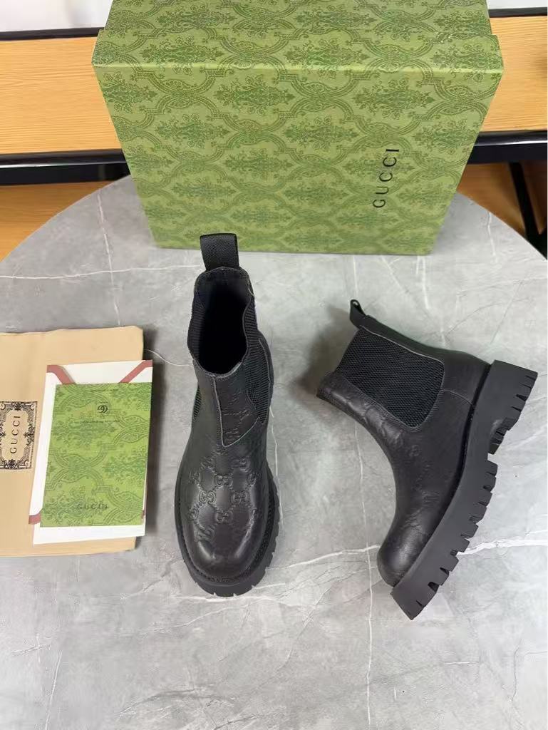 Choose the Gucci black embossed Chelsea boots and let your feet reflect modern elegance — where leather meets monogram, black meets color, and every step feels like a moment of power.