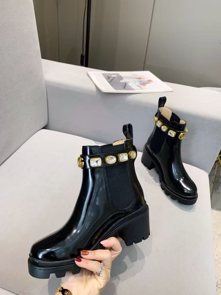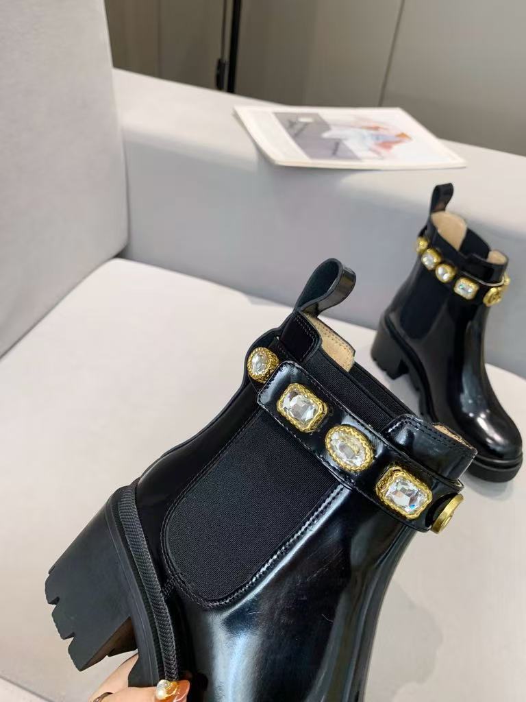 Step into glamorous authority with the Gucci black patent leather Chelsea boots, where classic elegance meets bold embellishment. Crafted from premium black patent leather with a high-gloss finish, these boots command attention — a fusion of timeless silhouette and modern sparkle.