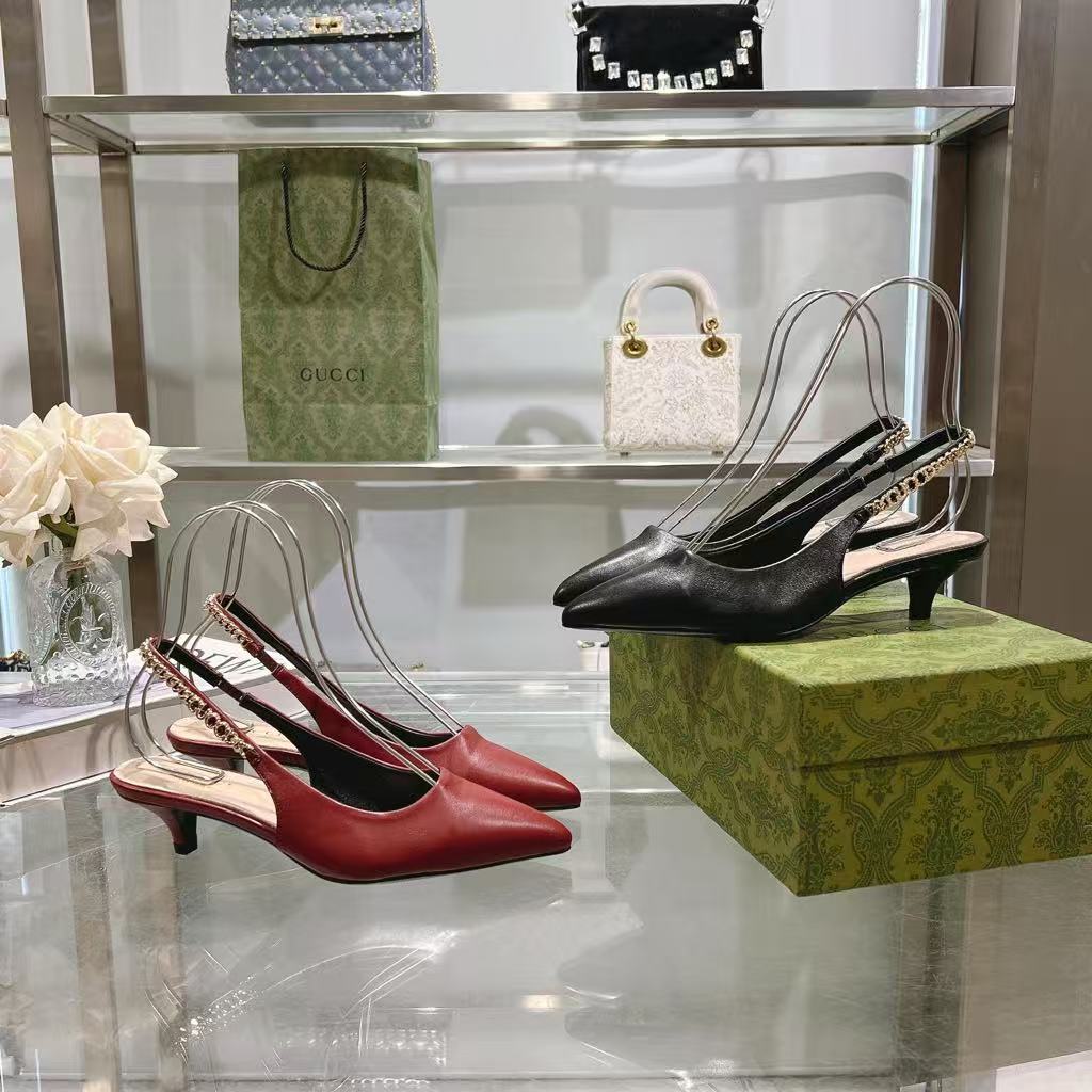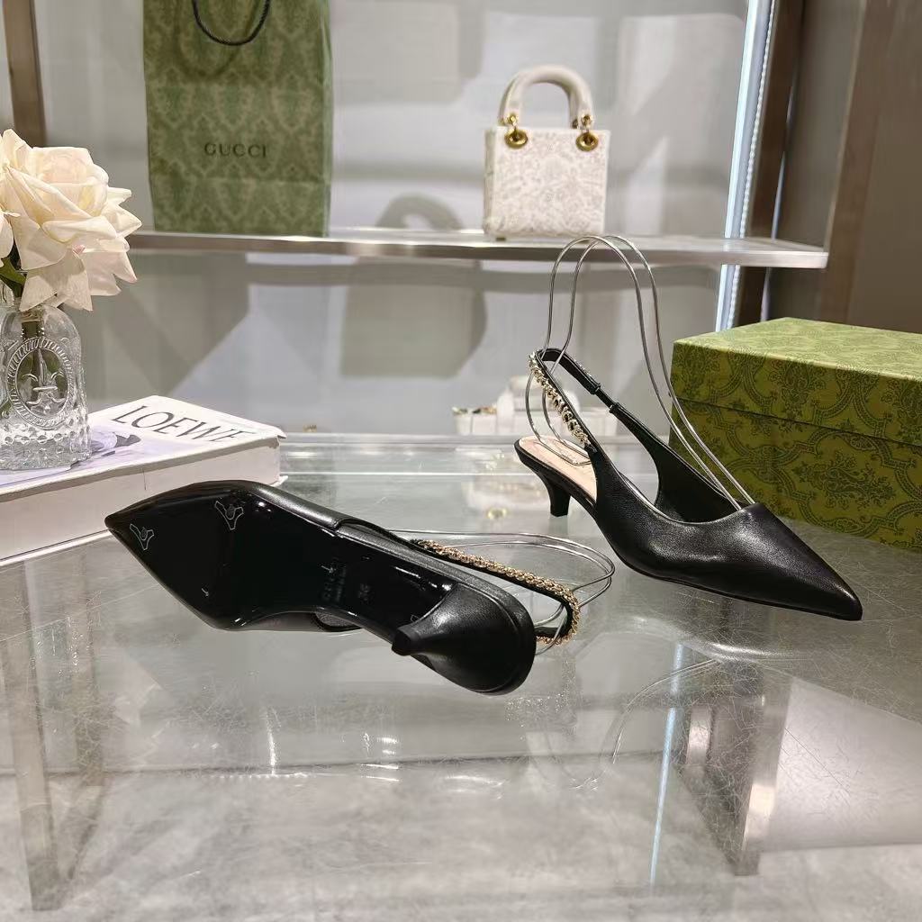 Step into refined power with the Gucci chain-strap slingback pumps, where minimalist design meets bold craftsmanship. Crafted from premium leather, these elegant heels feature a sharp pointed toe that elongates the foot and defines sophistication — a silhouette that never goes out of fashion.