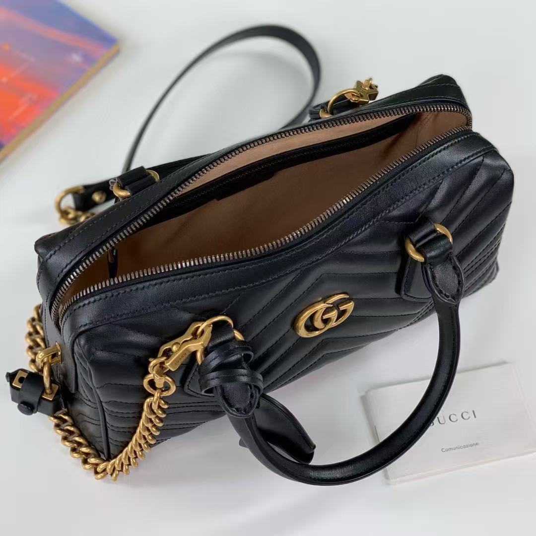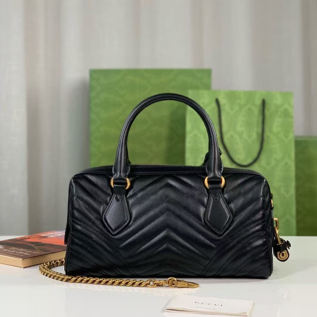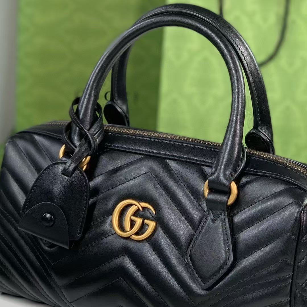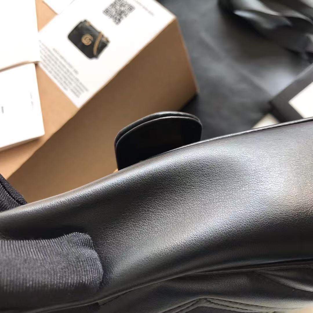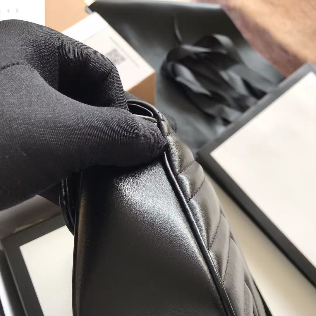 The deep black finish offers a versatile, high-fashion look that pairs effortlessly with both casual and formal wear. The hand-stitched chevron quilting adds texture, depth, and artisanal craftsmanship, while the iconic gold-tone double G logo serves as a luxurious focal point — embodying Gucci’s signature style.
