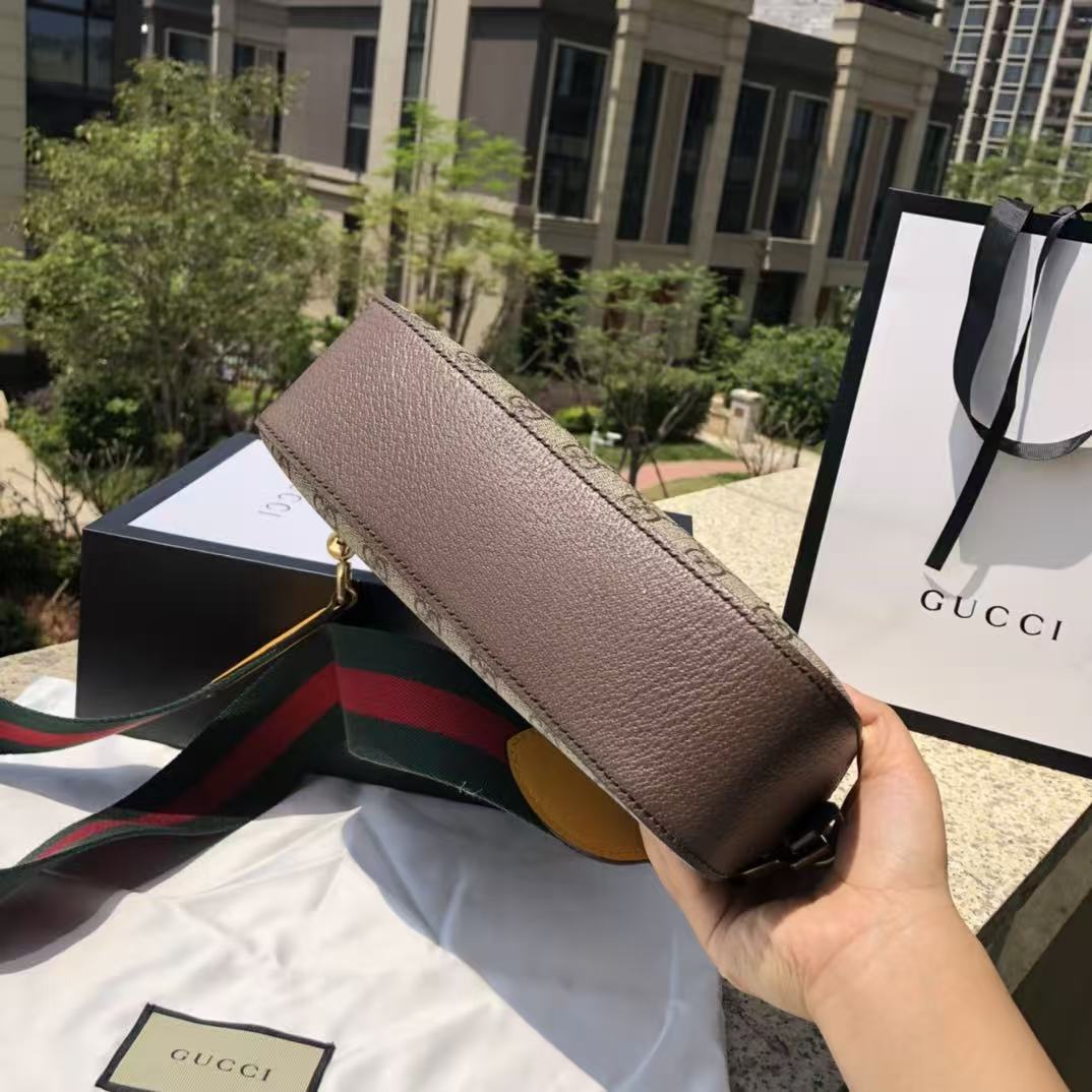 Gucci-Style Ophidia Mini Camera Bag – Beige GG Monogram Canvas with Red & Green Web Strap, Metal Logo Badge & Adjustable Shoulder Strap
