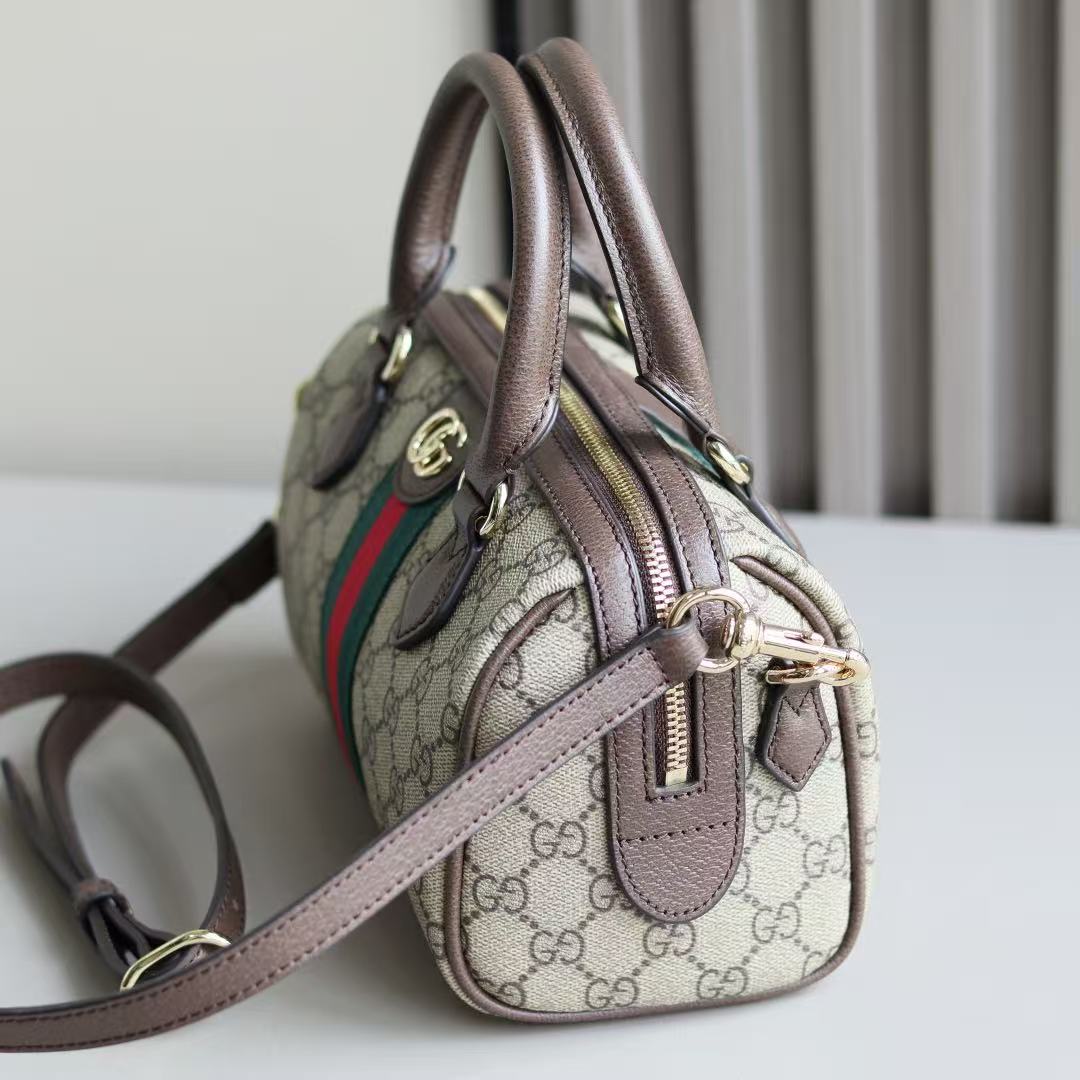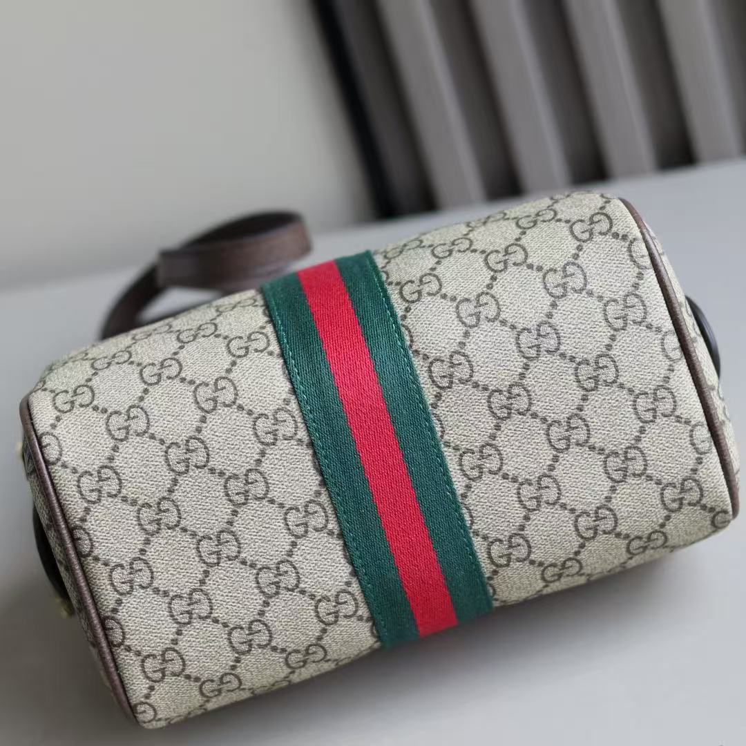 Gucci-Style Top Handle Mini Bag – Beige GG Monogram Canvas with Red & Green Web Stripe, Double G Buckle & Brown Leather Trim