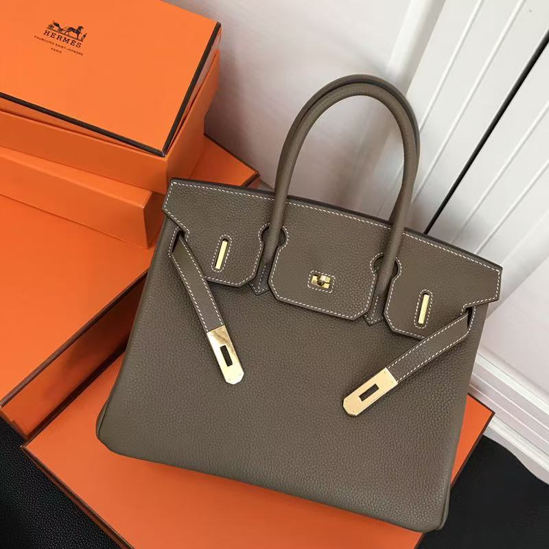 Hermès Birkin, grey handbag, Togo leather, gold hardware, luxury designer bag, high-end fashion, French craftsmanship, classic style, collectible piece