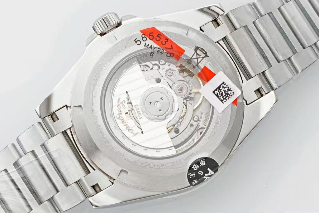 At the center, the iconic “LONGINES” logo is elegantly displayed above the winged hourglass emblem, symbolizing heritage and accuracy. Below it, the text “CONQUEST AUTOMATIC” highlights its self-winding mechanical movement, powered by natural wrist motion for reliable performance. A date window at 6 o’clock provides practical functionality without disrupting the balanced design. The “SWISS MADE” inscription underscores its high-quality craftsmanship and authenticity.