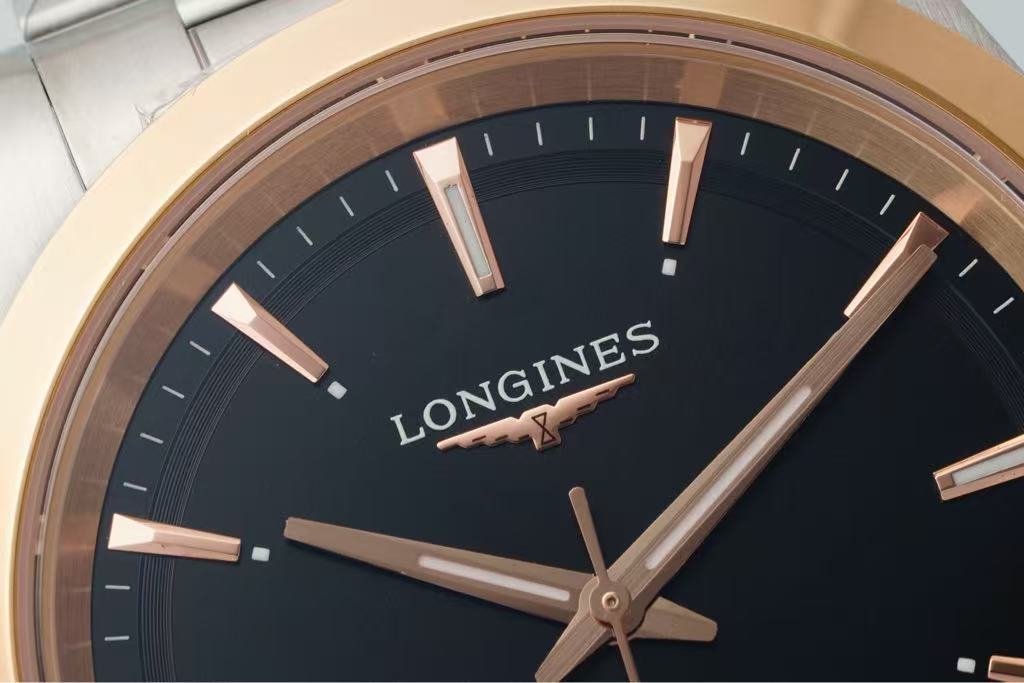 Elevate your style with the Longines Conquest, a bold fusion of modern design and Swiss precision engineering. This sophisticated men’s timepiece features a two-tone stainless steel case with a polished silver body and rose gold-tone bezel and crown, creating a striking contrast that blends elegance with contemporary flair. The black dial offers a sleek, minimalist surface enhanced by rose gold-tone hour markers and hands, ensuring excellent readability and refined aesthetics.