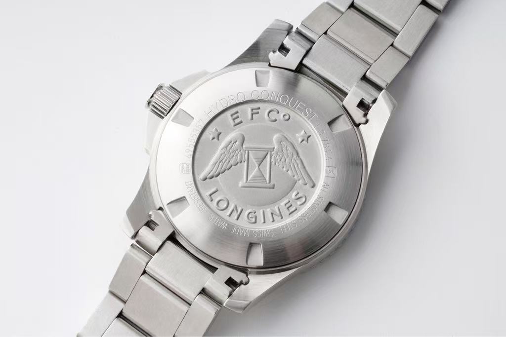 At the center, the “LONGINES” logo is elegantly displayed above the iconic winged hourglass emblem, symbolizing heritage and reliability. A date window at 3 o’clock provides practical functionality without disrupting the clean design. The rotating unidirectional bezel with minute markings ensures precise dive time tracking, while the screw-down crown enhances water resistance.