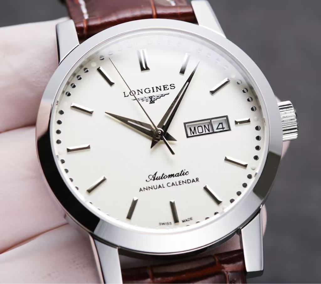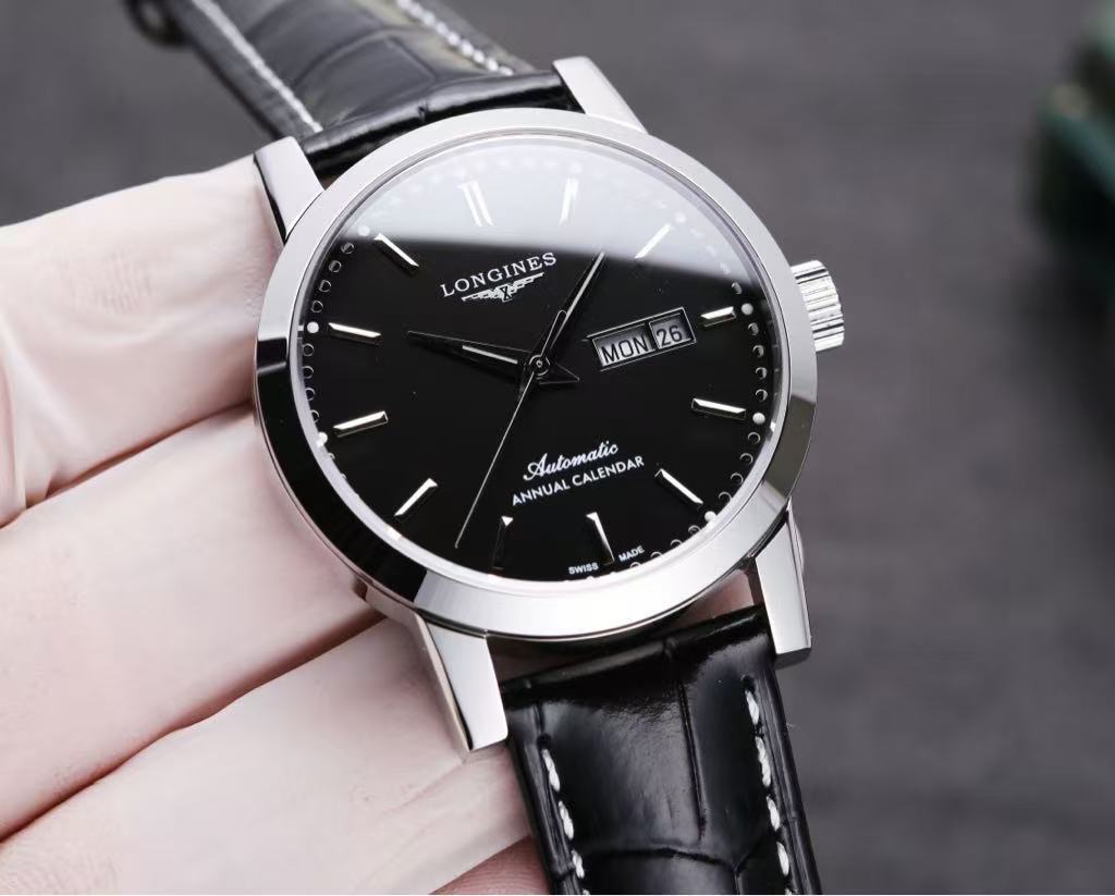 At the center, the iconic “LONGINES” logo is elegantly displayed above the winged hourglass emblem, symbolizing heritage and precision. Below it, the word “AUTOMATIC” highlights its self-winding mechanical movement, powered by natural wrist motion for reliable performance. A date window at 3 o’clock provides practical functionality without disrupting the clean design. The “SWISS MADE” inscription underscores its high-quality craftsmanship and authenticity.