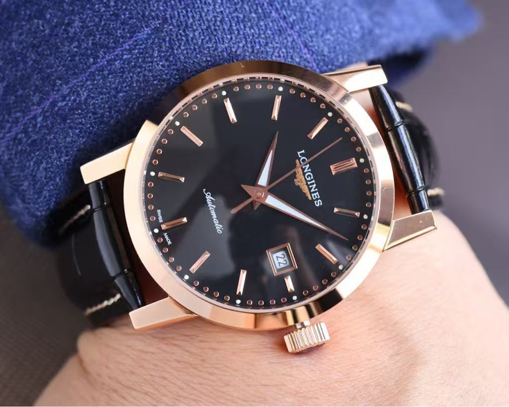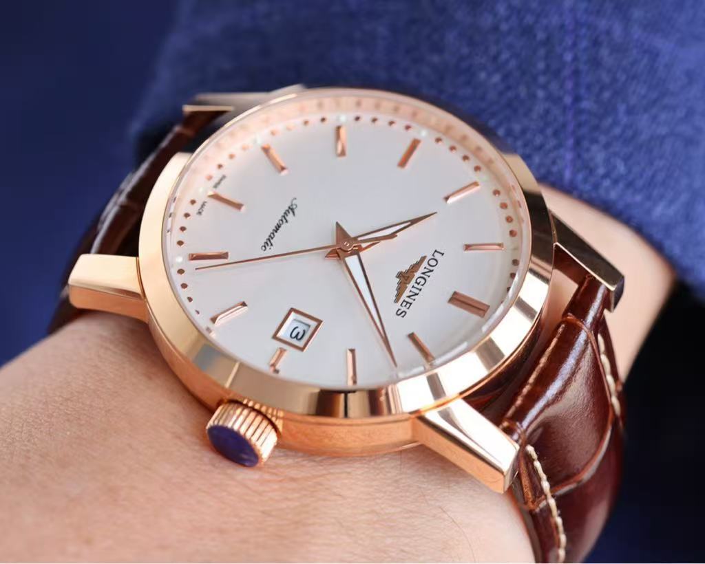 At the center, the iconic “LONGINES” logo is elegantly displayed above the winged hourglass emblem, symbolizing heritage and precision. Below it, the word “Automatic” subtly highlights its self-winding mechanical movement. A date window at 3 o’clock provides practical functionality without disrupting the clean design. The “Swiss Made” inscription at 6 o’clock underscores its high-quality craftsmanship.