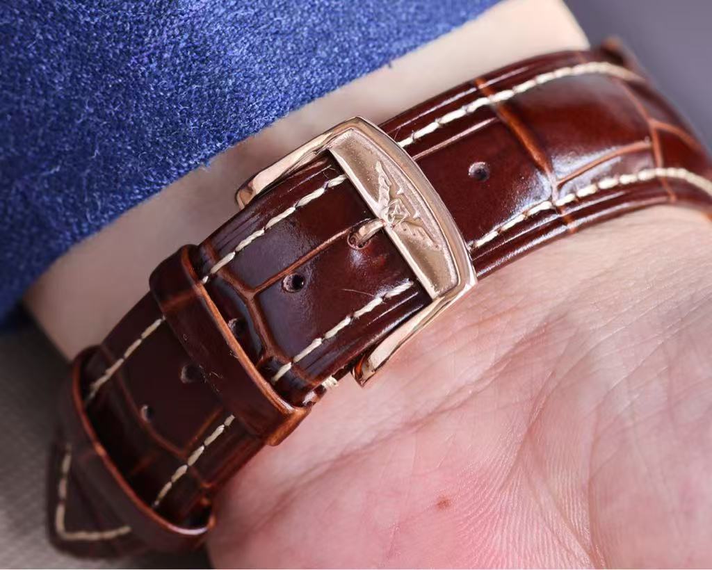 Complementing the case is a rich brown alligator-pattern leather strap with precise stitching and a smooth texture, offering both comfort and a premium feel. Secured with a polished rose gold-plated buckle, it ensures a secure and elegant fit on the wrist.