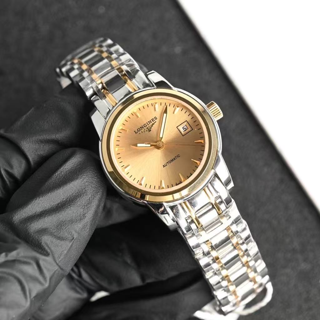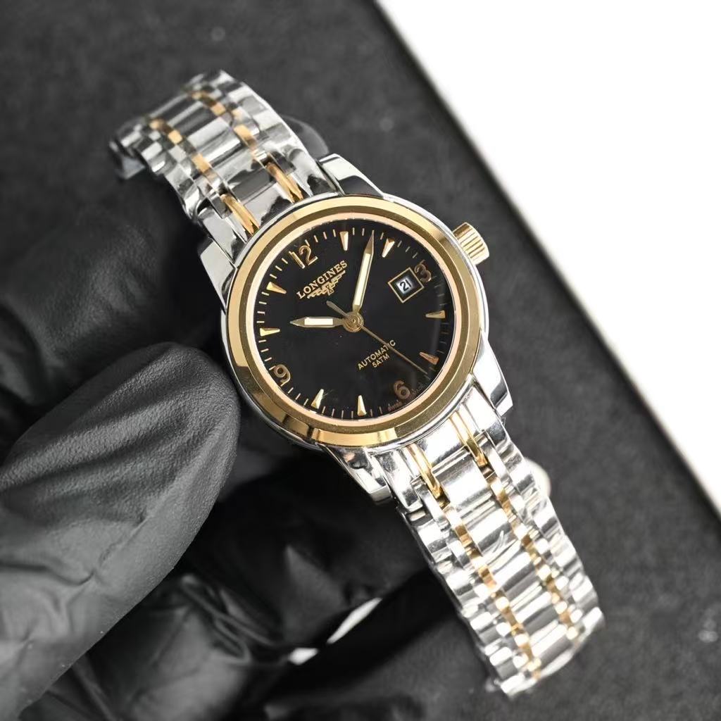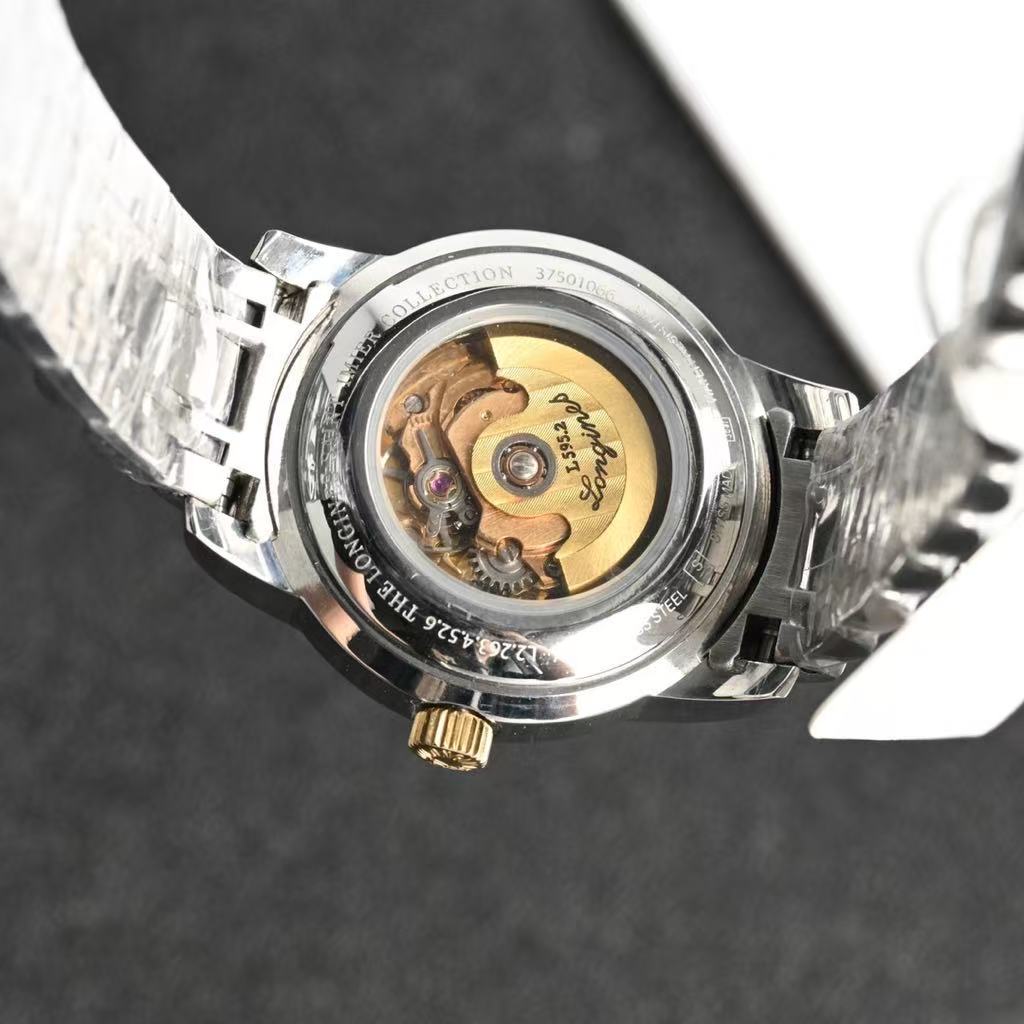 At the center, the iconic “LONGINES” logo is elegantly displayed above the winged hourglass emblem, symbolizing heritage and precision. Below it, the word “AUTOMATIC” highlights its self-winding mechanical movement, powered by natural wrist motion for reliable performance. A date window at 3 o’clock provides practical functionality without disrupting the clean design. The “SWISS MADE” inscription underscores its high-quality craftsmanship and authenticity.