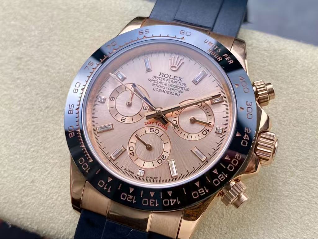 Experience the perfect blend of performance, elegance, and innovation with this stunning luxury chronograph watch inspired by the iconic Rolex Cosmograph Daytona. Crafted in polished rose gold, it exudes sophistication and confidence from every angle. The champagne-colored sunburst dial features a radiant finish that reflects light with warmth and depth, creating a dynamic visual effect perfect for both formal and casual settings.
