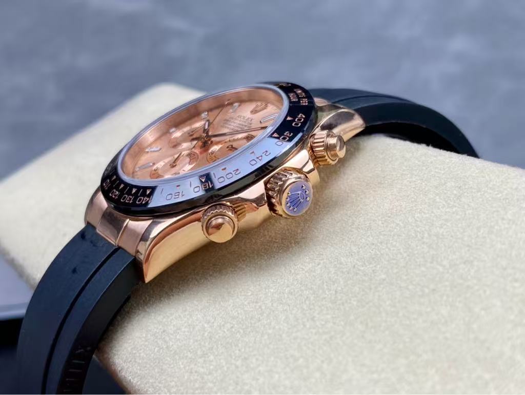 Luxury Daytona-Style Chronograph Watch – Rose Gold Case, Champagne Dial, Black Ceramic Bezel, Rubber Strap