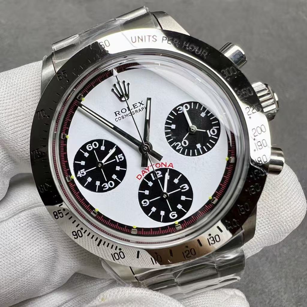 Experience the thrill of speed and precision with this elegant luxury chronograph watch inspired by the iconic Rolex Cosmograph Daytona. Featuring a clean white dial with three black sub-dials, this timepiece delivers high contrast and excellent readability — perfect for both racing enthusiasts and style-conscious individuals. The tachymeter bezel marked “Units Per Hour” adds a sporty edge, ideal for measuring speed and enhancing its dynamic appeal.